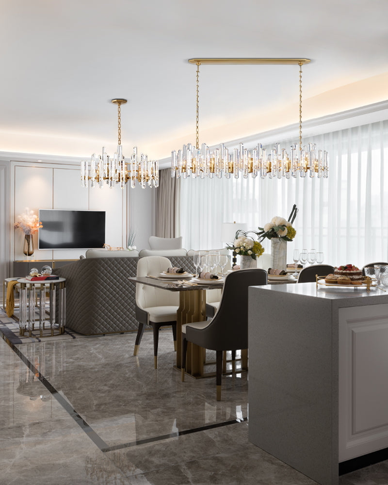 The designer combines ultra-transparent glass with a sturdy brass frame, and the crystals reflect light both inside and outside, making your living room or dining room look more beautiful and vivid.