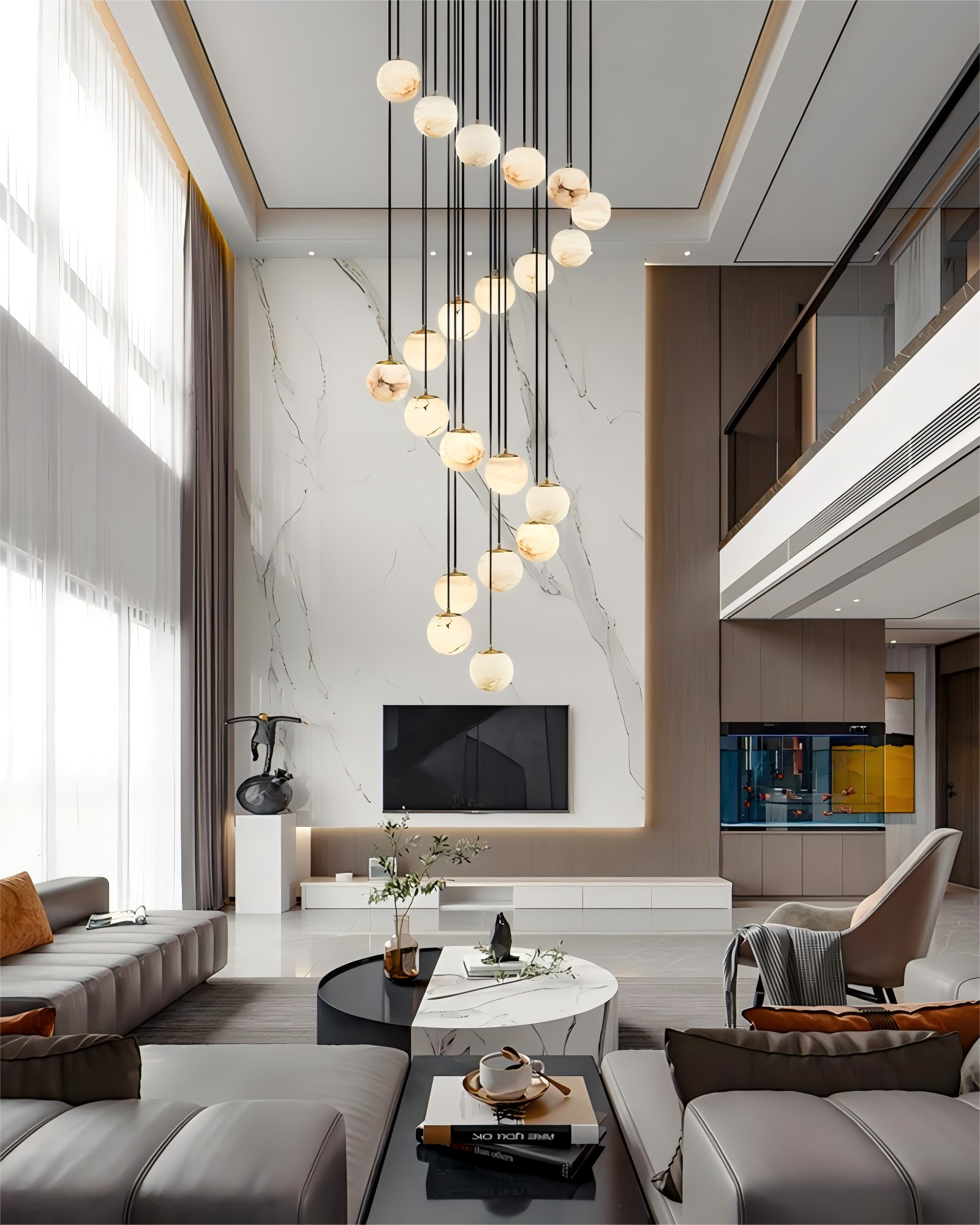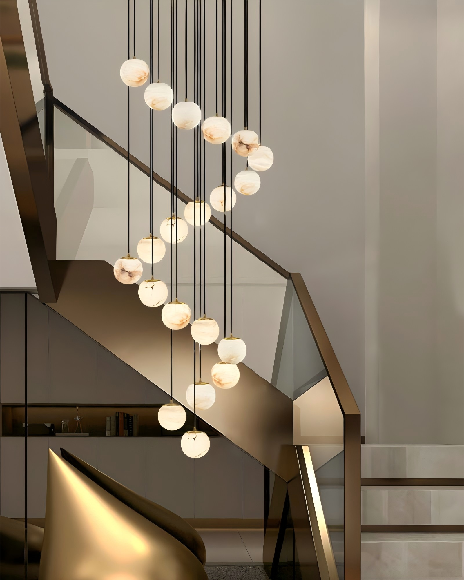 Elevate your home decor with the Luxury Multi-Globe Alabaster Light. This stunning chandelier features multiple alabaster globes suspended at varying heights, creating a dynamic and elegant visual effect. Perfect for staircases and grand entryways, it adds a touch of sophistication and luxury to any space.
