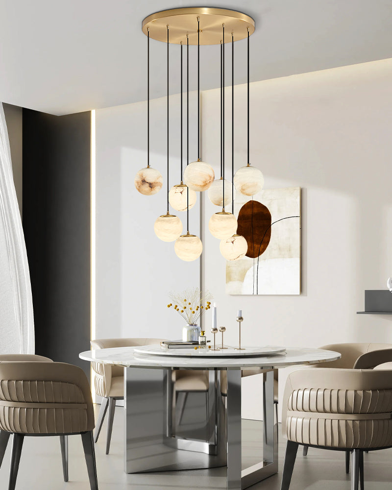 This stunning chandelier features multiple alabaster globes suspended at varying heights, creating a dynamic and elegant visual effect.