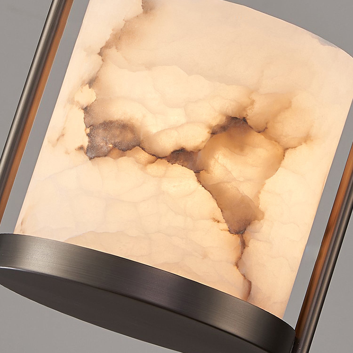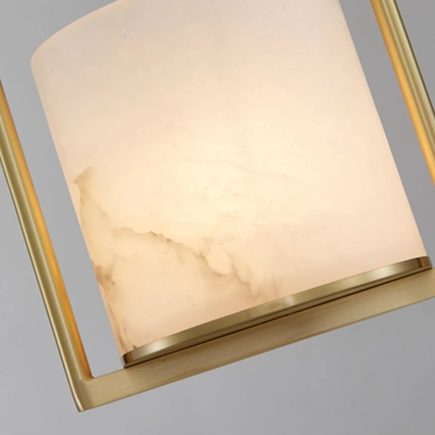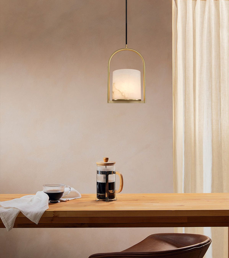 Elevate your space with our Vintage Industrial Pendant Light-Featuring a sculptural cylindrical design in brushed brass and matte nickel, this fixture pairs the organic warmth of hand-carved alabaster with sleek geometric metal framing.