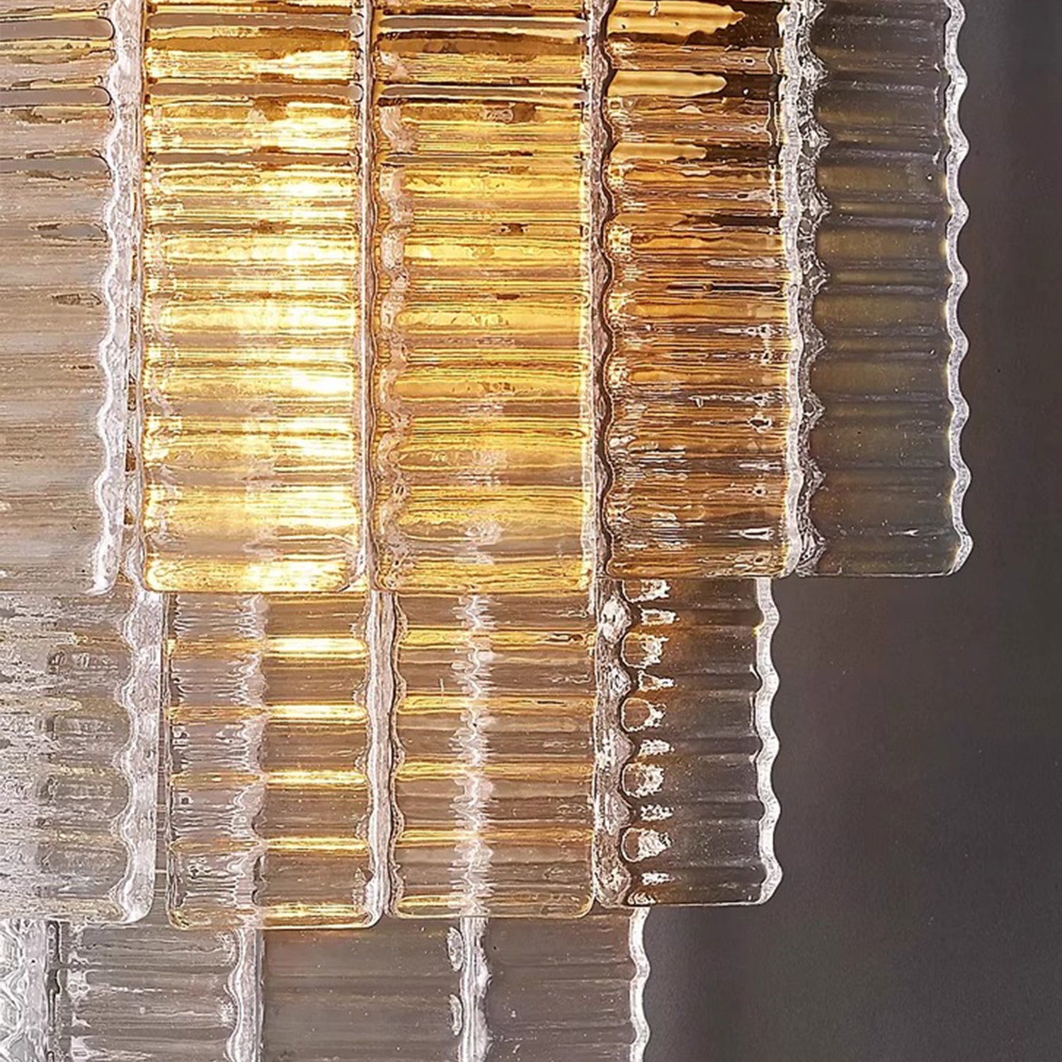 The collection's chandeliers combine traditional glassmaking techniques with modernist style. It is a study in geometric repetition, with textured ribbons of cast glass cascading in concentric circles, casting a warm glow to stunning effect.