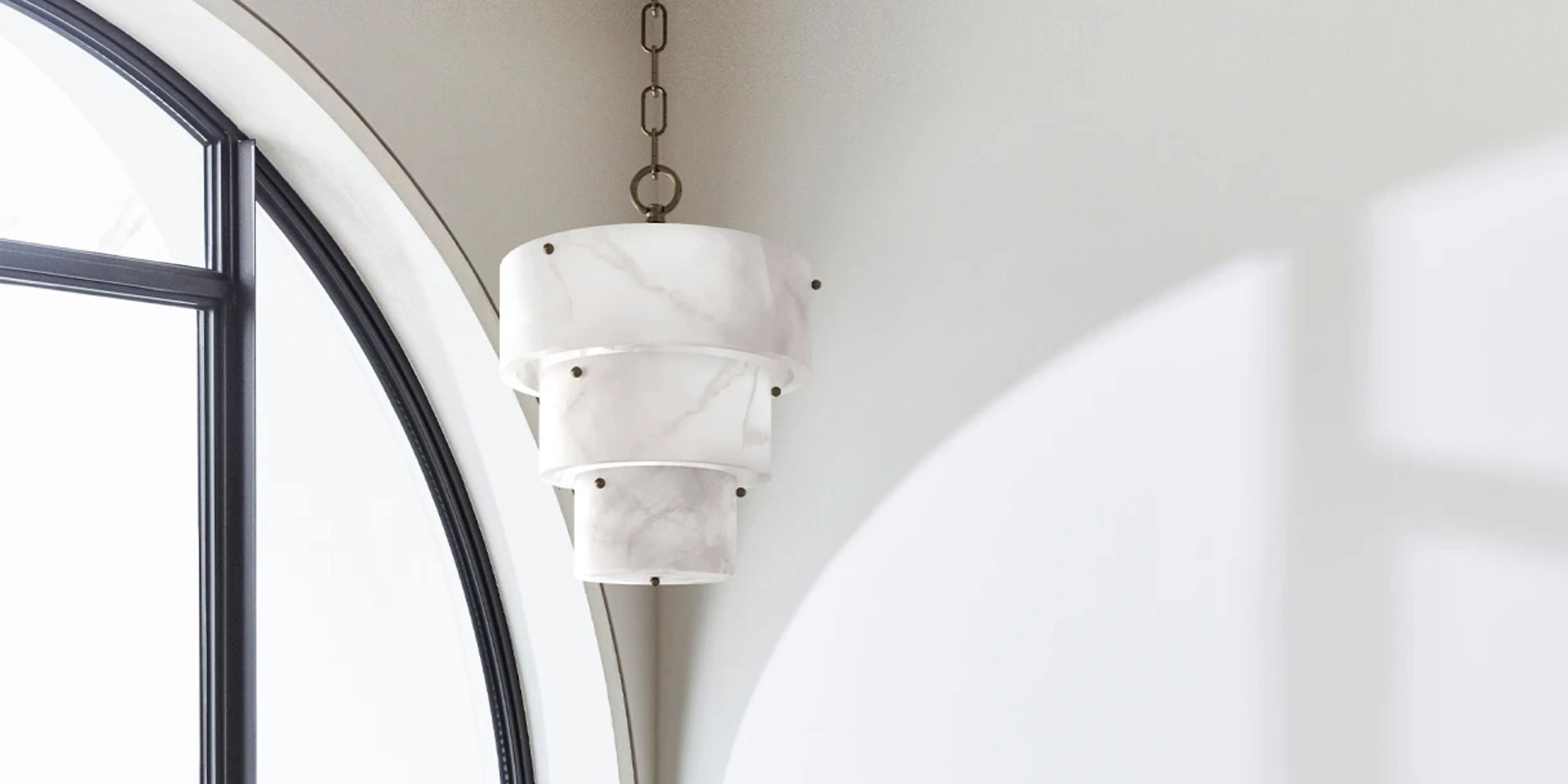 Gleaming golden brass elements frame the pendant, adding a touch of opulence while complementing the alabaster’s soft, earthy tones.
