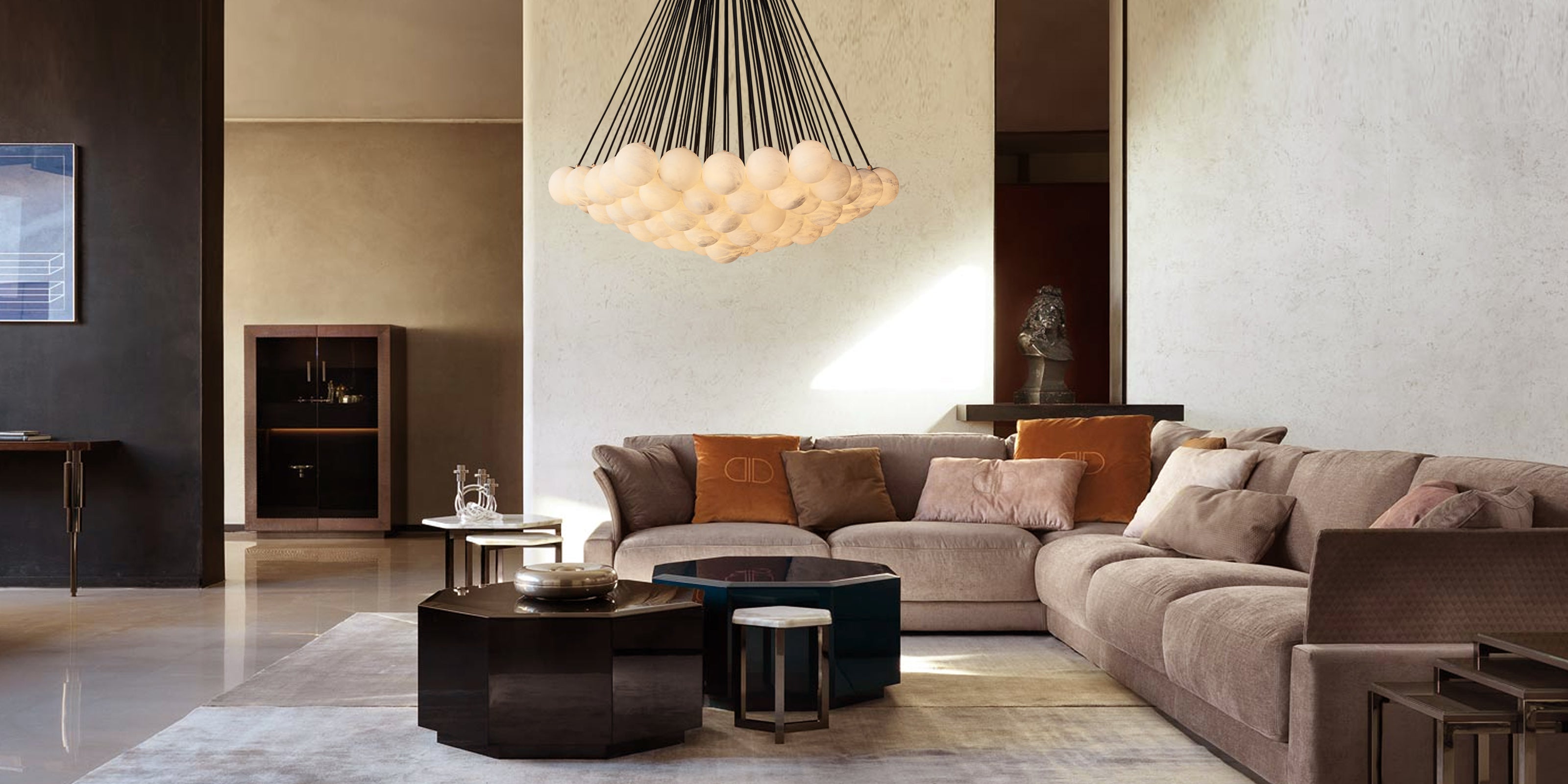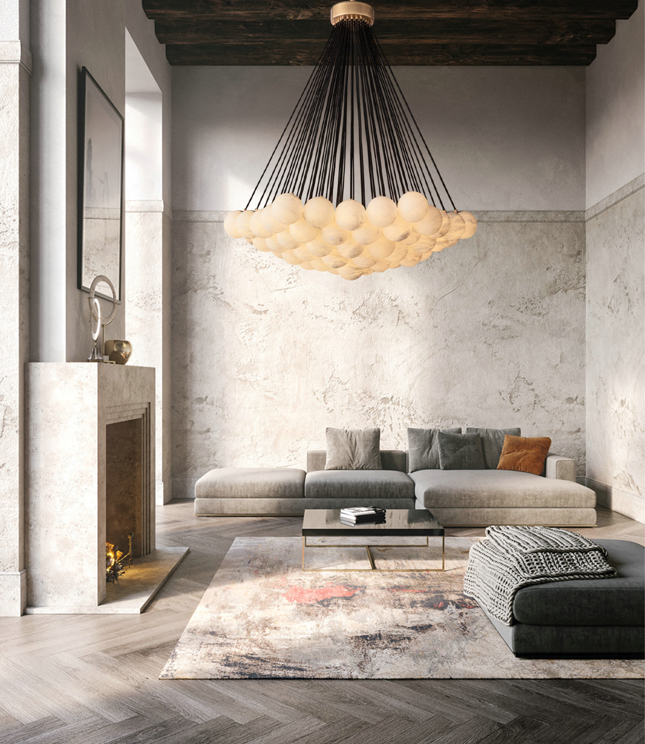 - 30 alabaster globes (4“/5"/6") cluster organically for modern-art elegance.