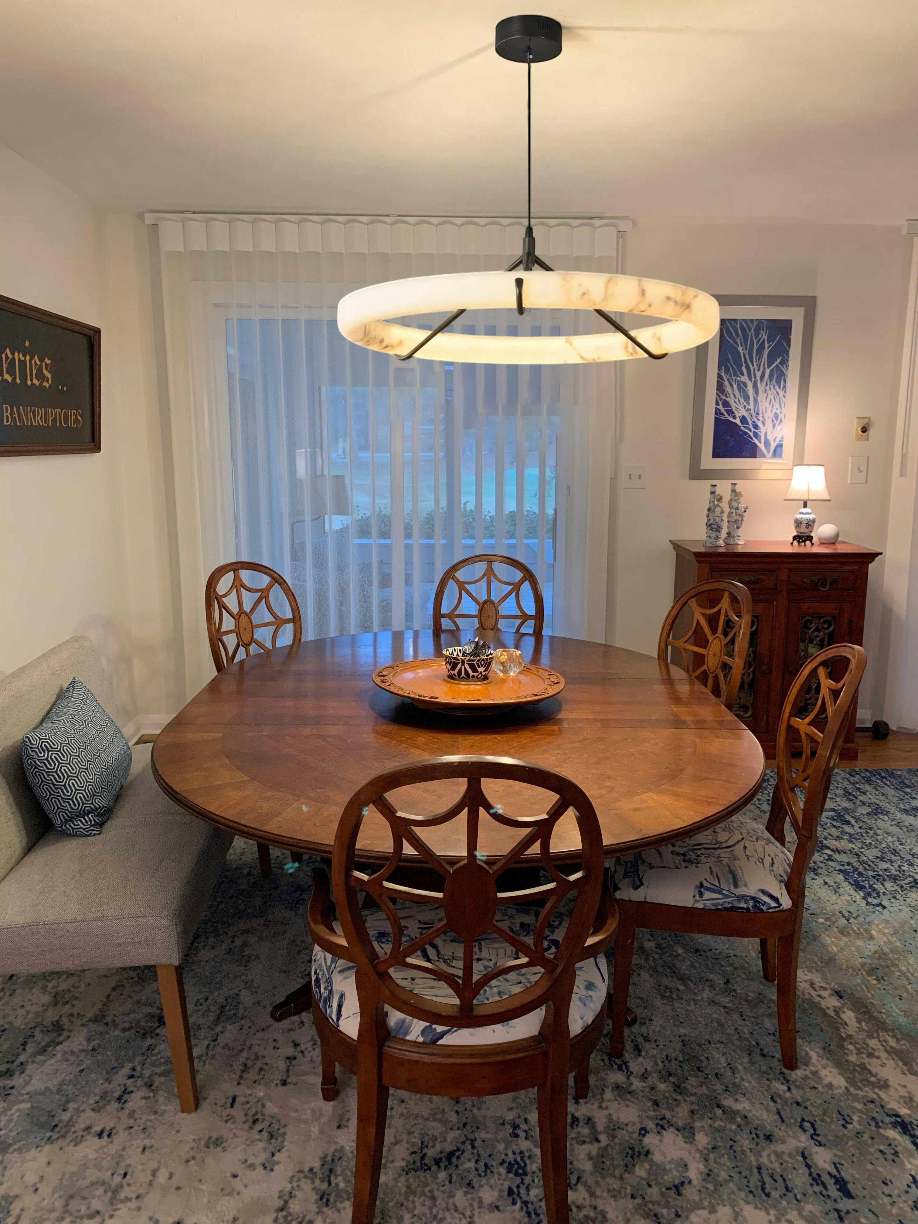Expertly crafted with modern design and luminous alabaster, this dining room chandelier adds a touch of elegance to any space.