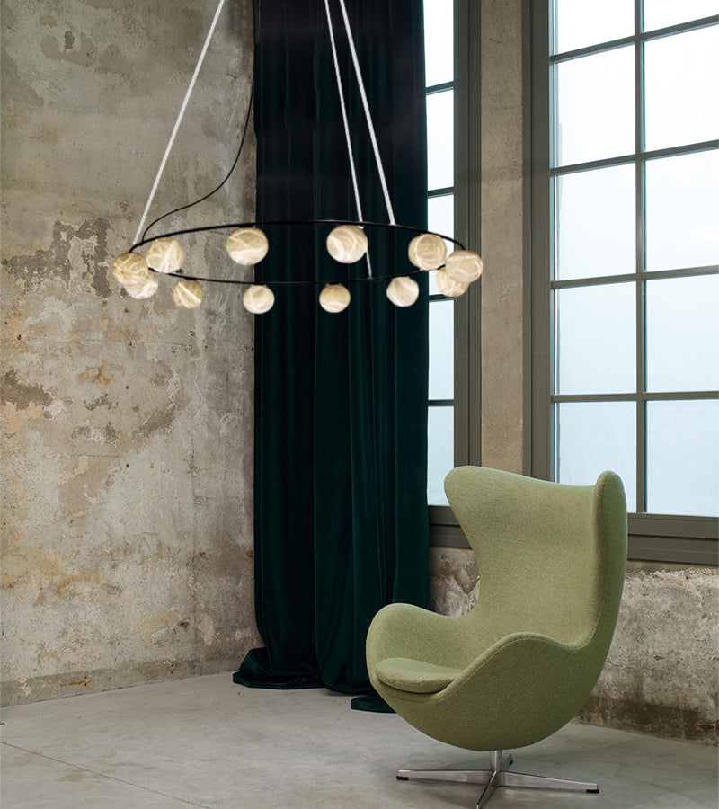Illuminate your decor with the Chandelier, where antique black meets the celestial beauty of alabaster in a harmonious dance of luxury and sophistication. Carved from solid alabaster, its adjustable wires allow for custom compositions, enabling you to create a truly unique and captivating design.