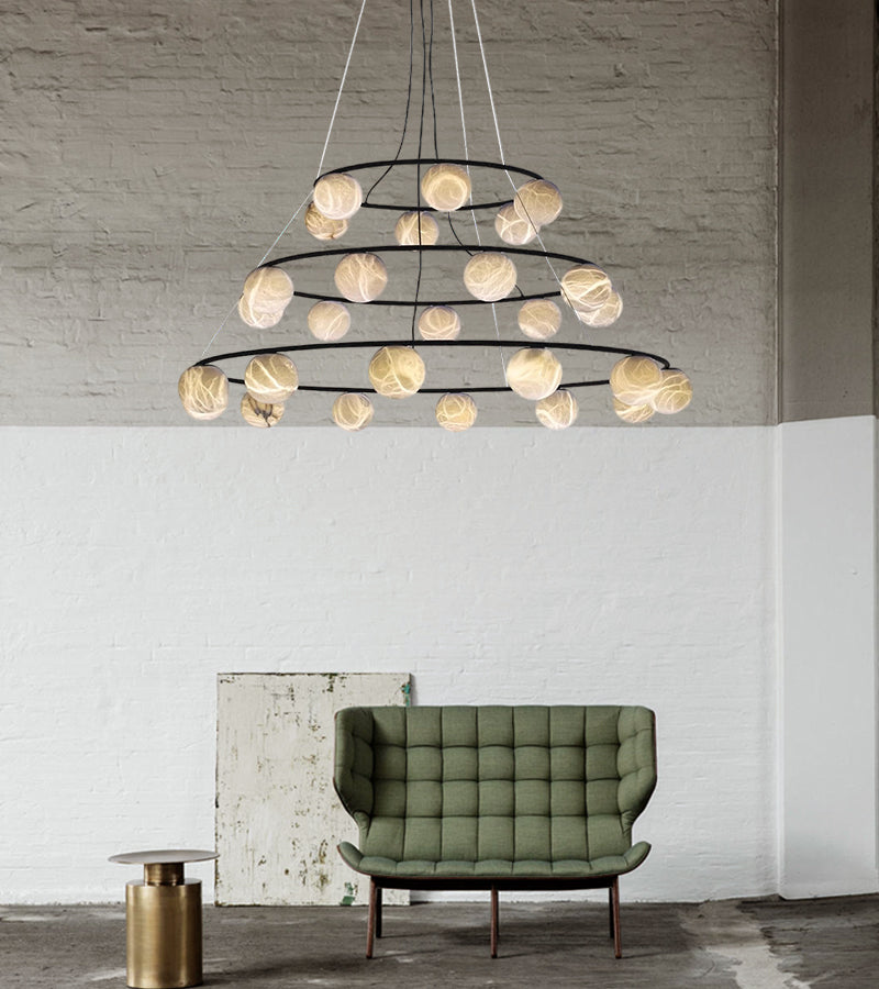 This impressive luminaire is composed of large rings of 100,120 and 150cm in diameter, with options of 6,9,12 or 27 shades, which can be installed individually or combined in double, triple, or even larger sets.