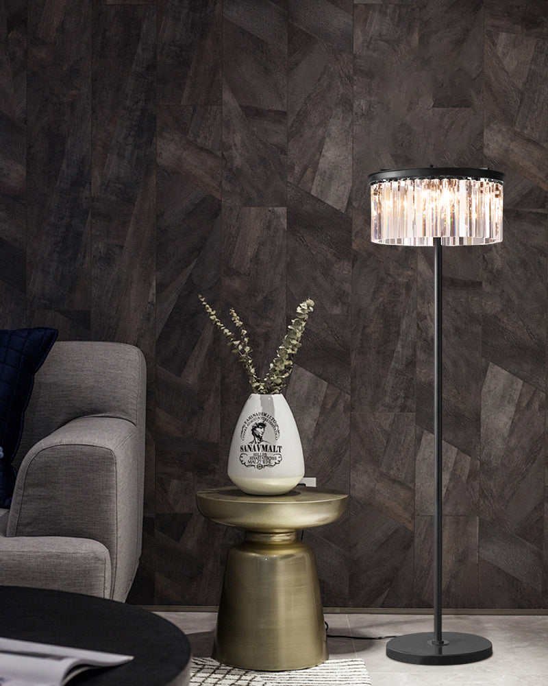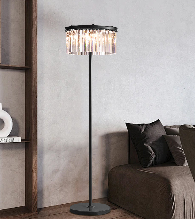 This product is a 6-bulb standing lamp with a rustic design and 2-layer crystal block. It is made from black material and is intended for use in the living room.