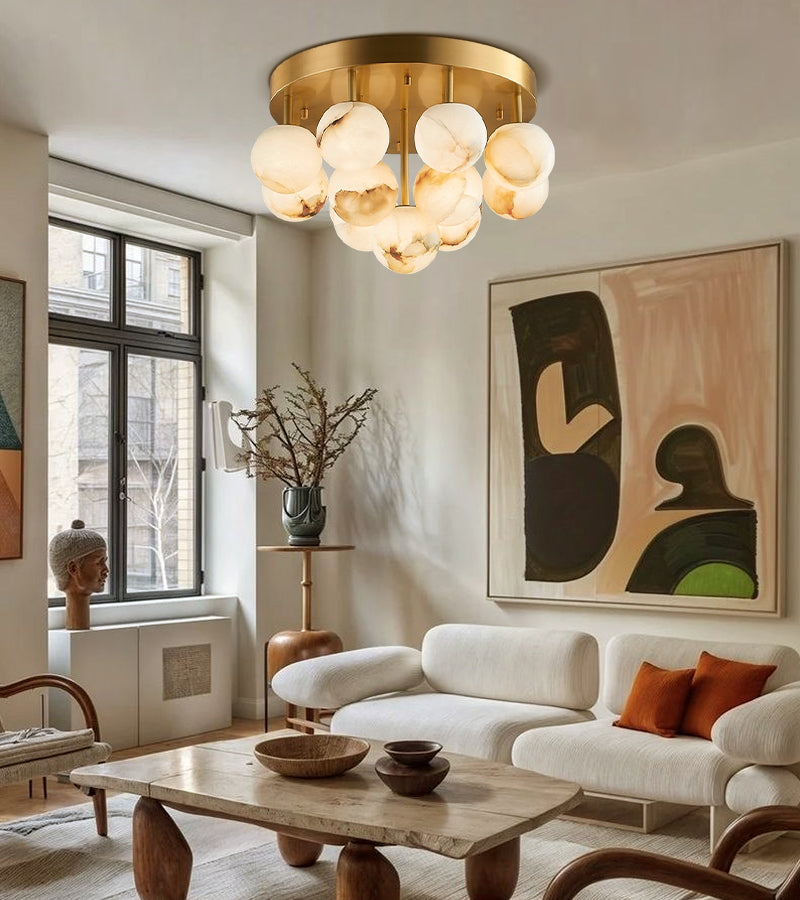 Semi-flush fixtures blending timeless elegance & modern minimalism. Soft Brass finish with Faux Alabaster accents + etched Opal Nature Stone globe. Perfect for dining rooms, bedrooms, or entryways.