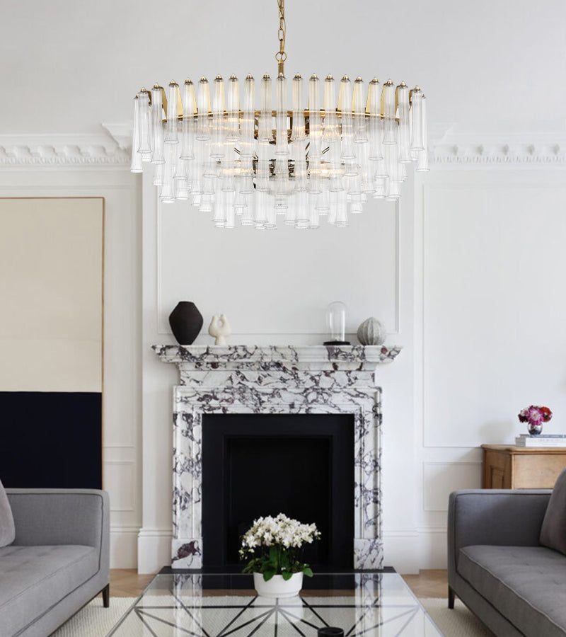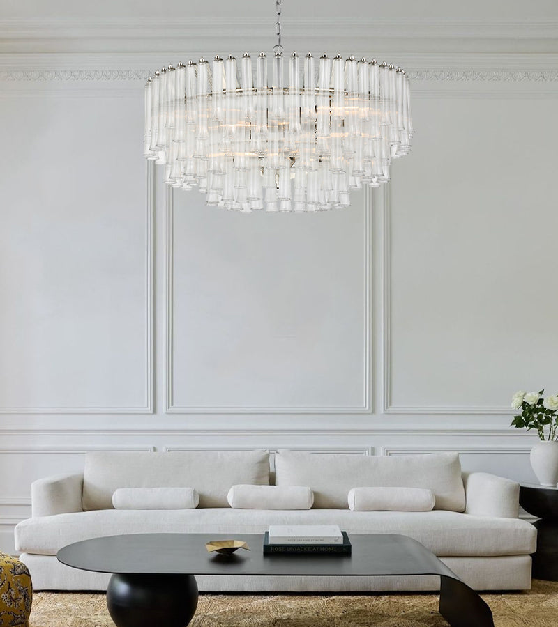 Elegant, fluted glass tubes cascade in concentric tiers, partially shielding a gleaming metal frame.This exquisite chandelier combines brilliant illumination with luxurious design, casting radiant highlights and a surrounding glow—perfect for elevating glamorous, high-end interiors.