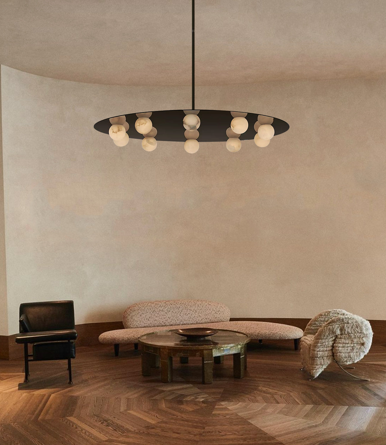 Elevate your space with the Pertica LED Disc Pendant Light. Its modern, minimalist design features a slim brass disc that elegantly frames an alabaster globe, emitting soft, diffused light.