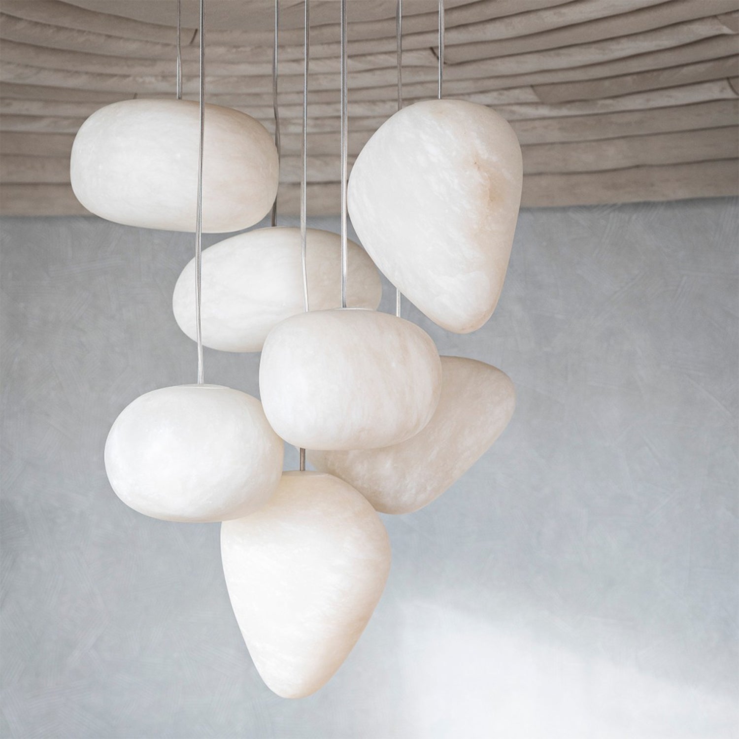 Organic in shape and flawlessly crafted, each alabaster piece is by handmade. The result is individual pendants that are one-of-a-kind in form and beauty, which are combined to create a singular fixture with dynamic scale, movement and sculptural appeal.