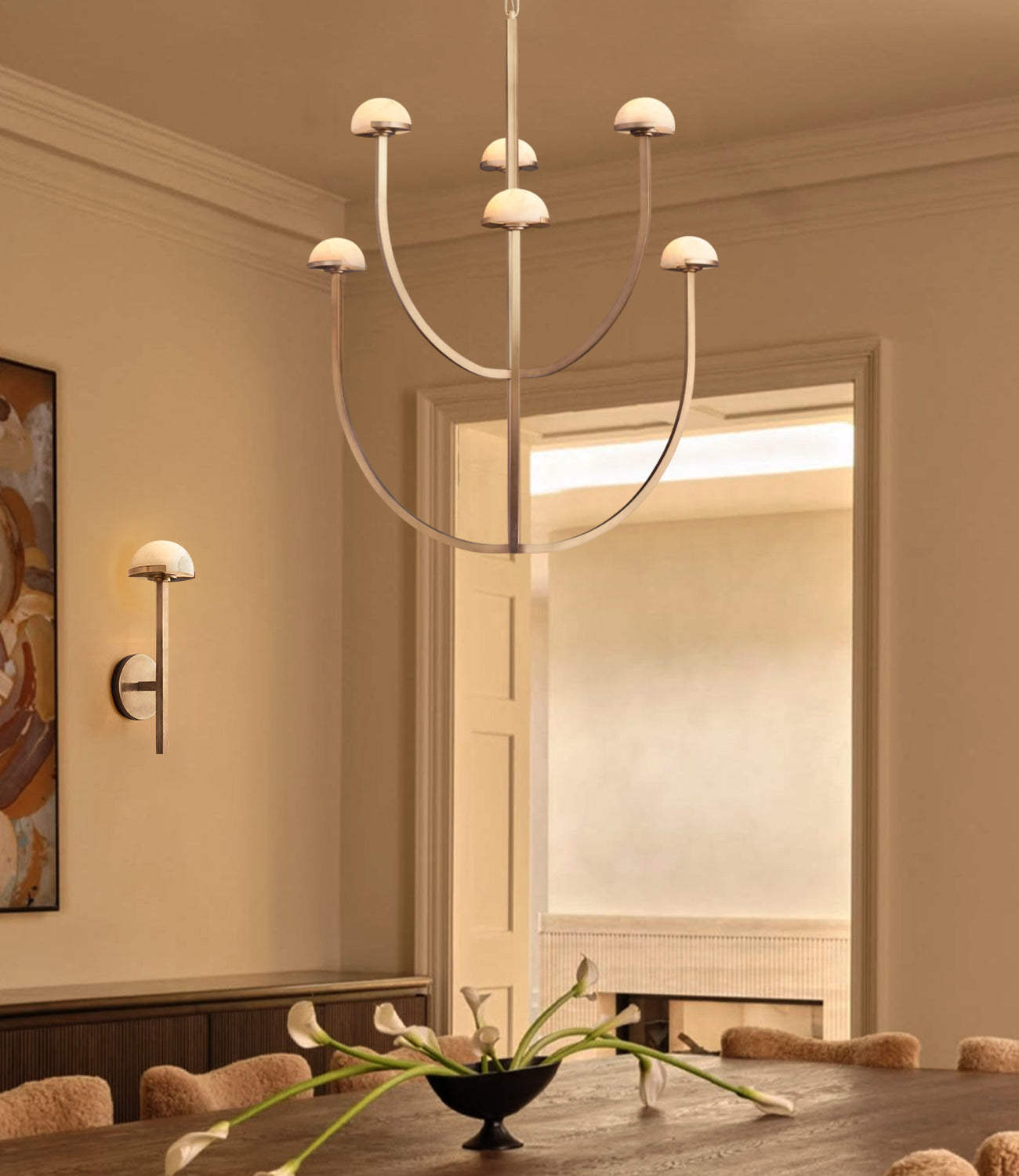 - Sculptural Two-Tier Design: A dramatic focal point with linear metal arms and organic dome shapes.