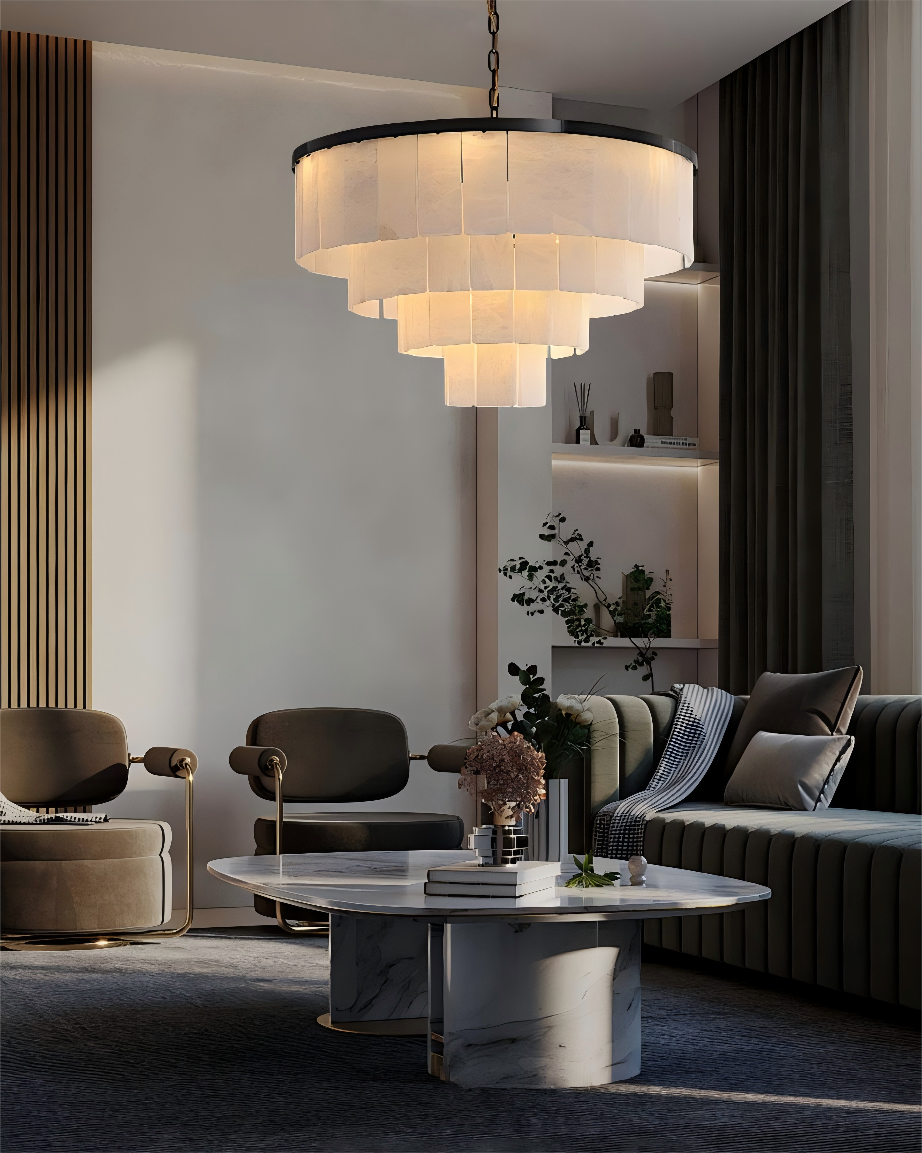 The stunning ceiling-mounted alabaster series lamps combine the elegance and functionality of modern large chandeliers, perfectly suited to a variety of room sizes, and the delicate balance between texture and color enhances the luxury of the space.