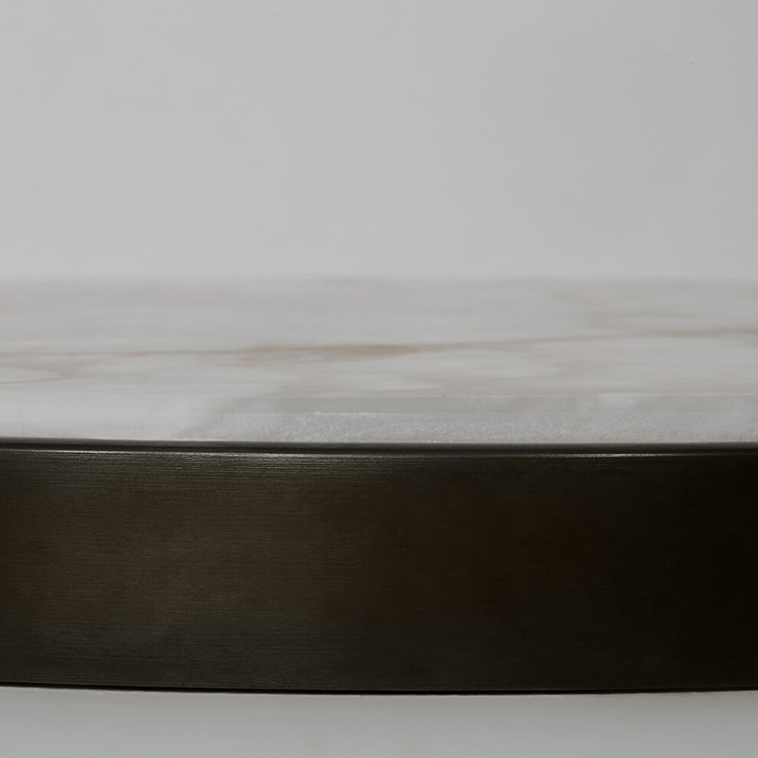 The translucent disc of honed alabaster is encased within solid brass, creating a pure and elegant piece. The natural striations within the alabaster, produce an individual and distinctive feature.