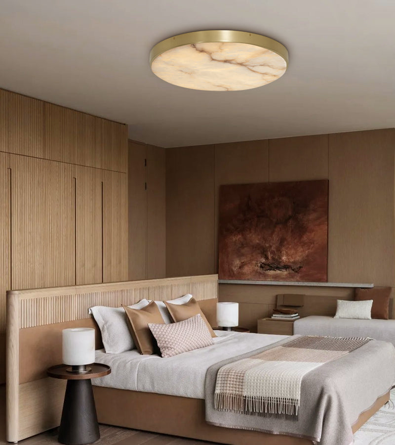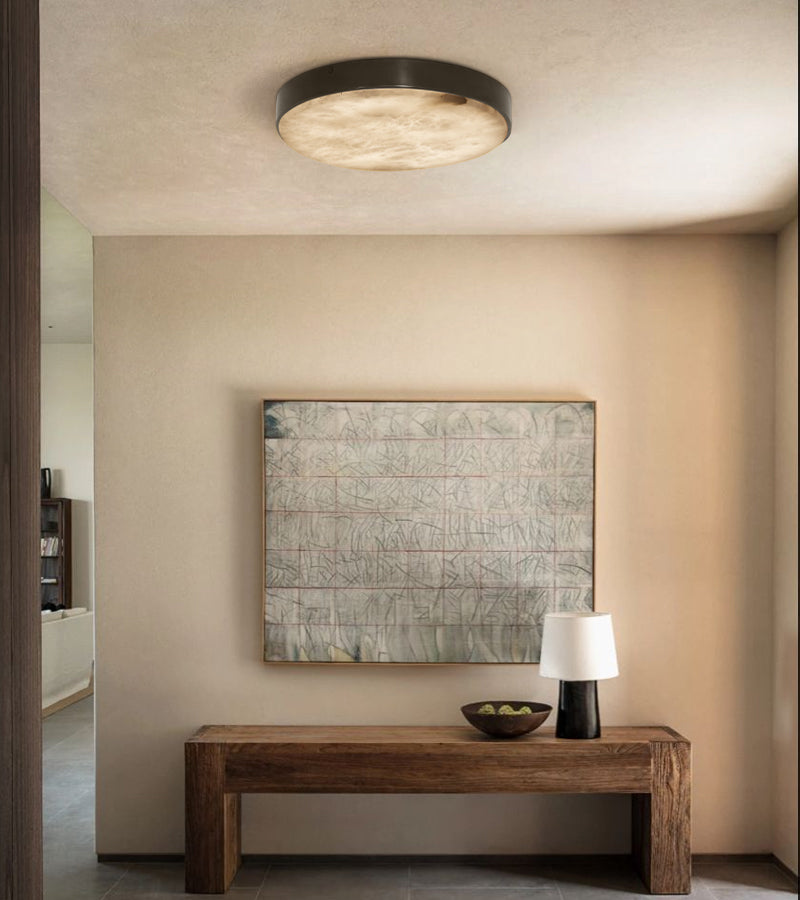 Discover the Anvers Collection, where minimalist design harmonizes with nature's artistry. Defined by a refined, low-profile silhouette, this lighting series features a handcrafted disc of translucent natural alabaster stone, expertly honed to diffuse a soft, ambient glow.