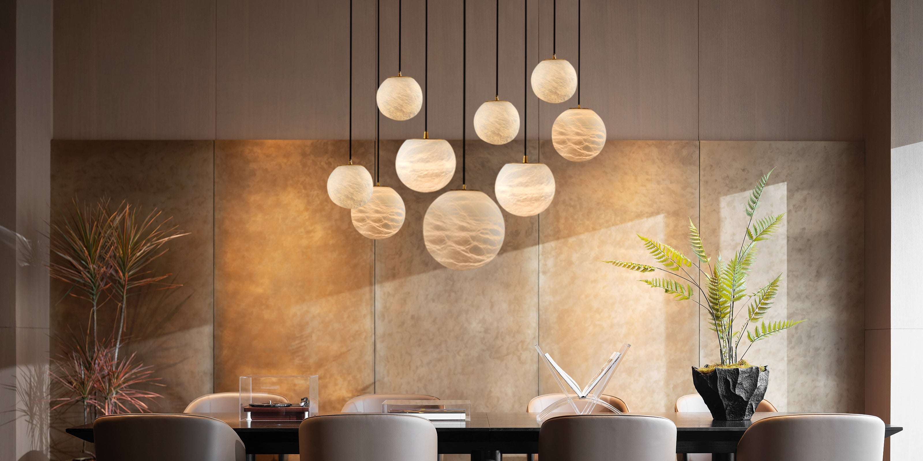 Consisting of cascading sculpted alabaster orbs in various sizes and adjustable heights, the chandelier casts a captivating glow like a bright cluster of stars. An exquisite, handcrafted design, it beautifully showcases the natural texture and luminous quality of alabaster.