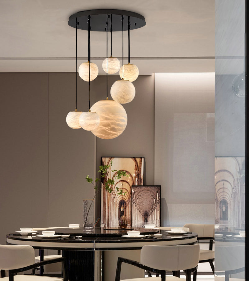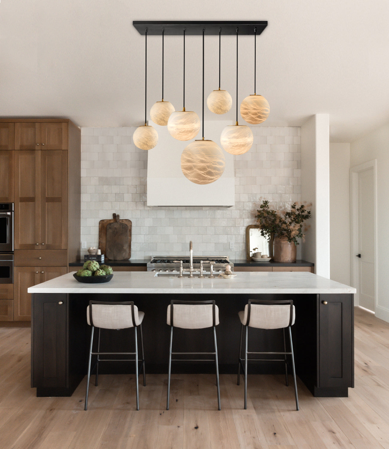 Art Decor Linear Moon Alabaster Globe Multi-Light Chandelier for Dining Kitchen Ambience