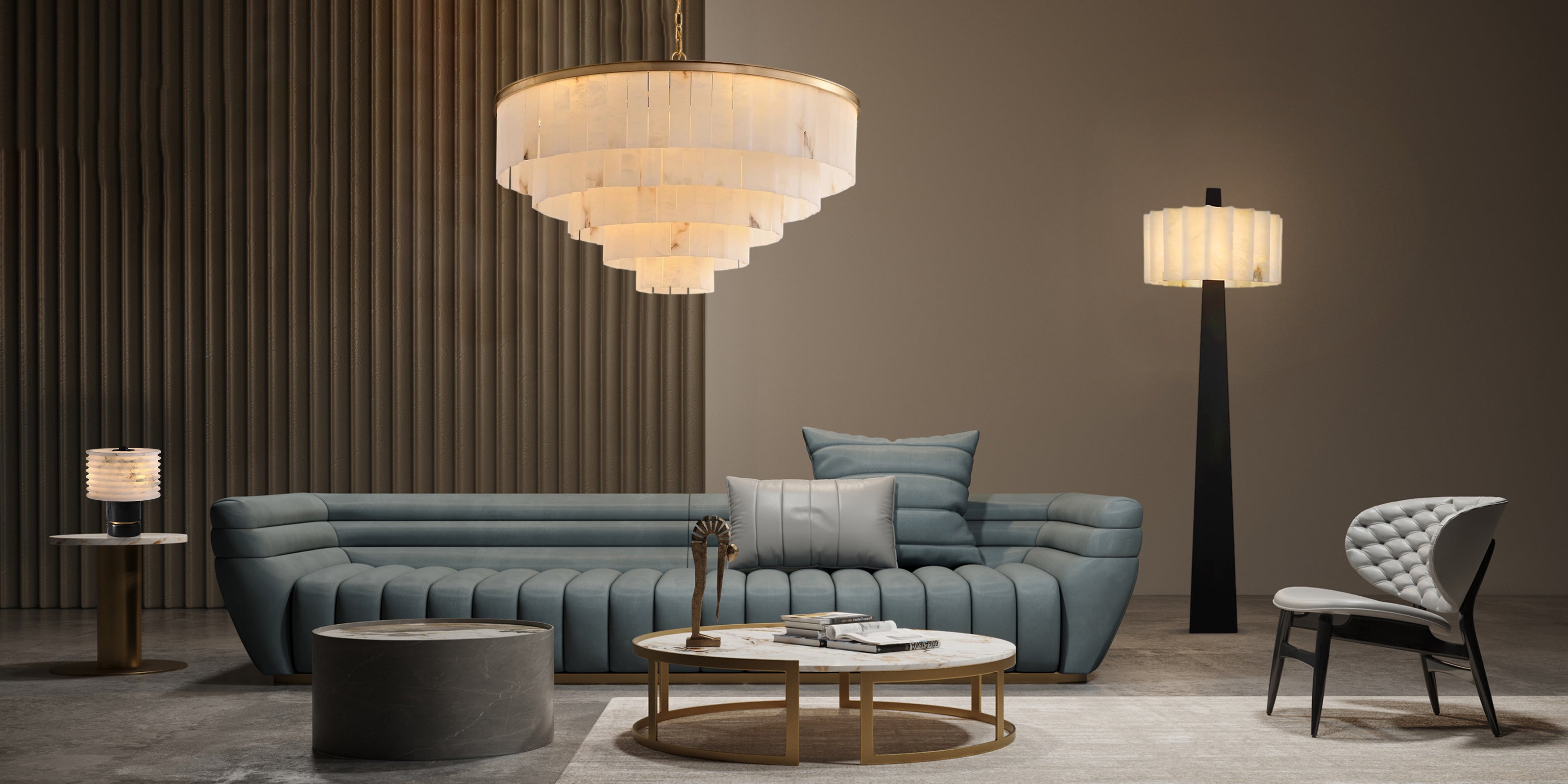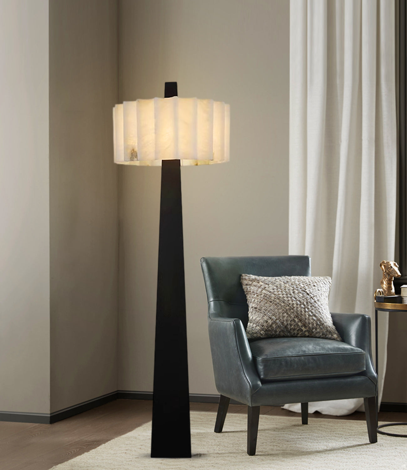 - Sculptural Minimalism-Sleek steel base + hand-carved alabaster shade.