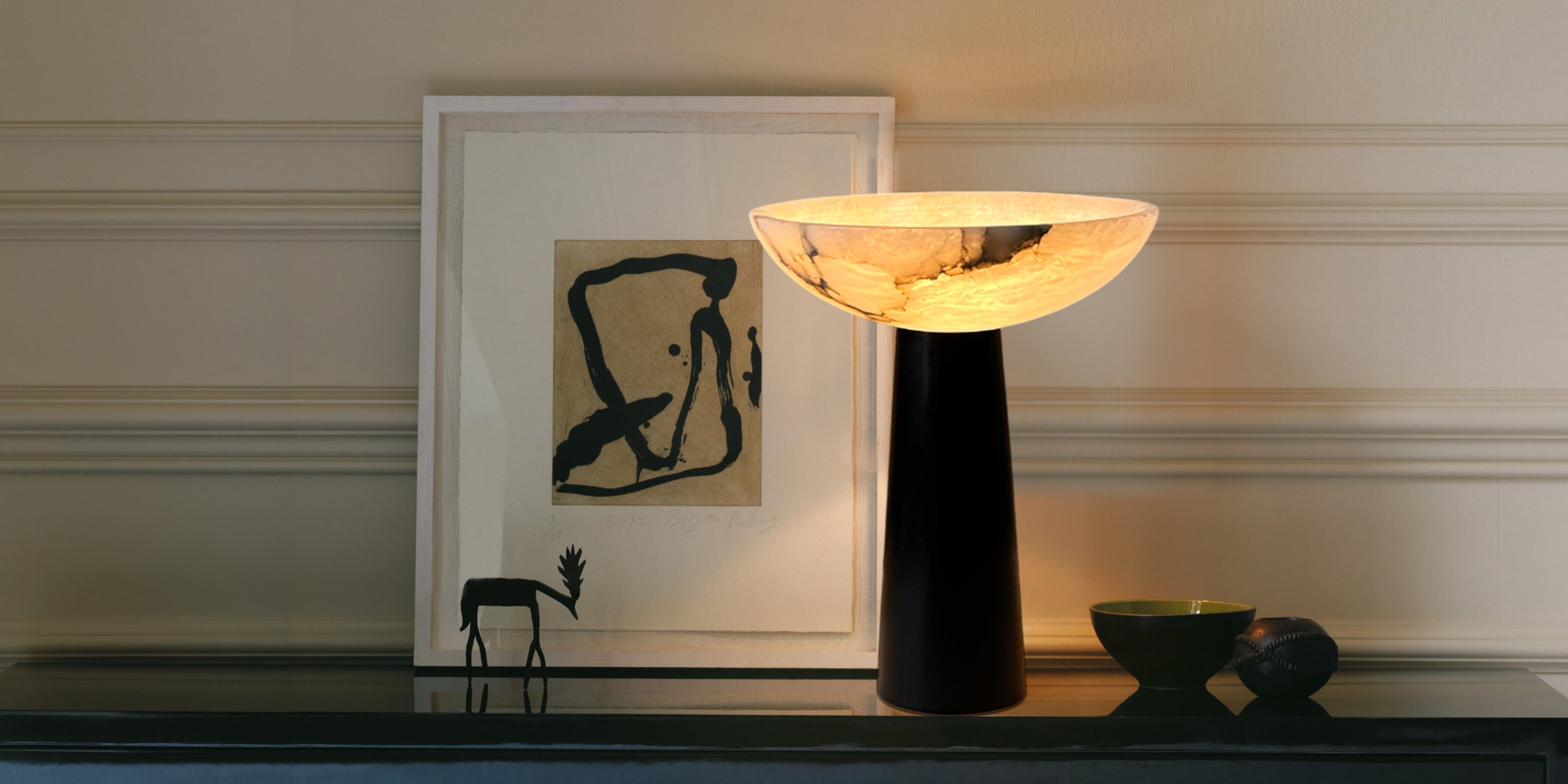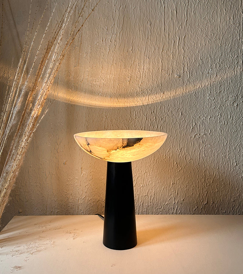 Defined by its elegant silhouette, the Aura Table Lamp features a hand-polished alabaster bowl that sits atop a striking conical base. Designed as an uplight, it casts a serene, diffused glow across walls and ceilings, transforming any room into a tranquil sanctuary.