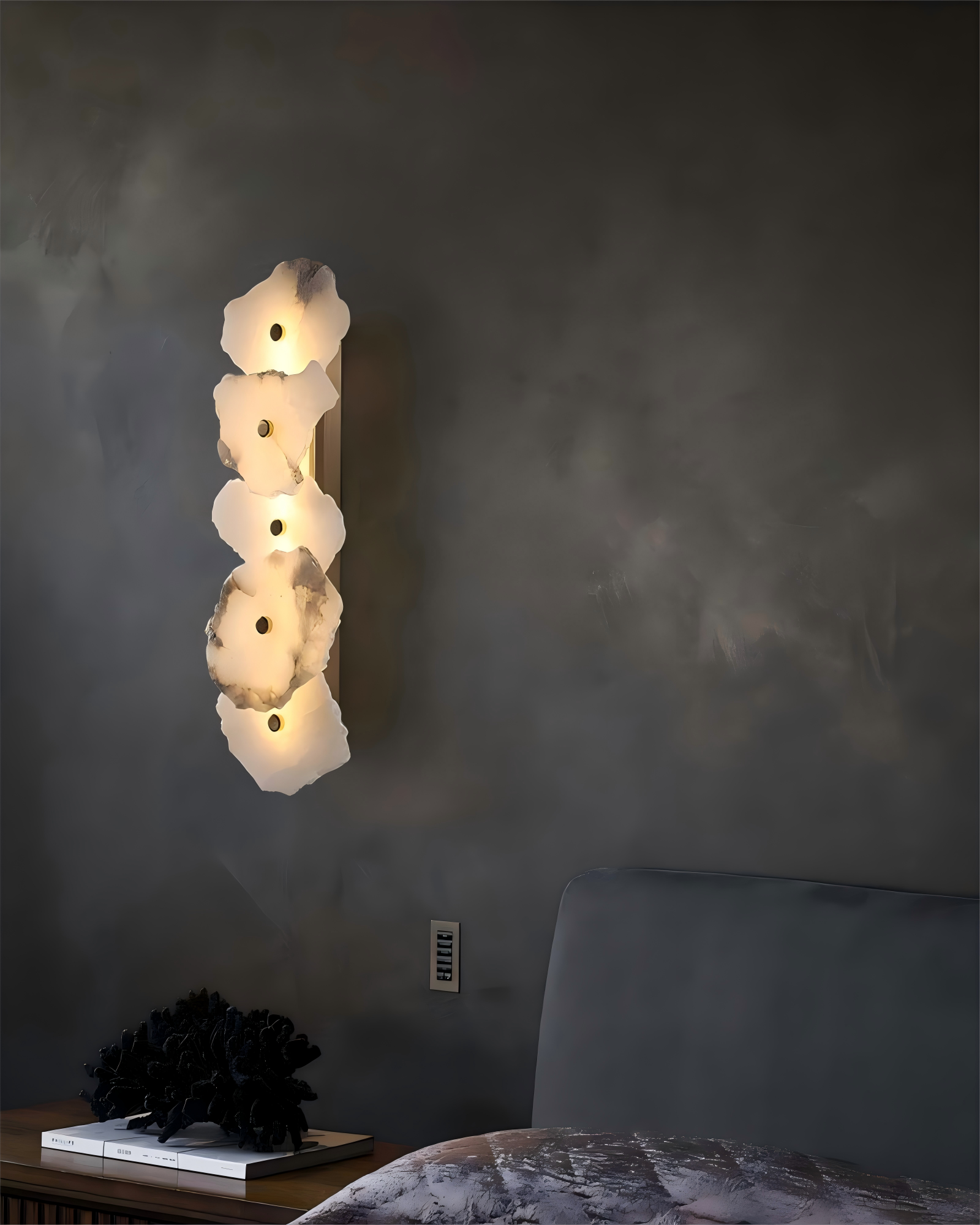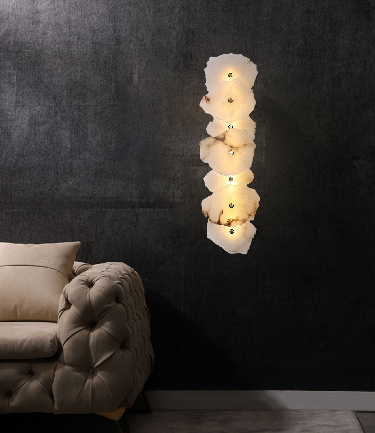 Add a touch of art deco elegance to your home with the White Marble Slice Metal Wall Sconce. This exquisite fixture features random-shaped marble slices, each piece showcasing its own distinct veining and translucence, set against a sleek metal backdrop.