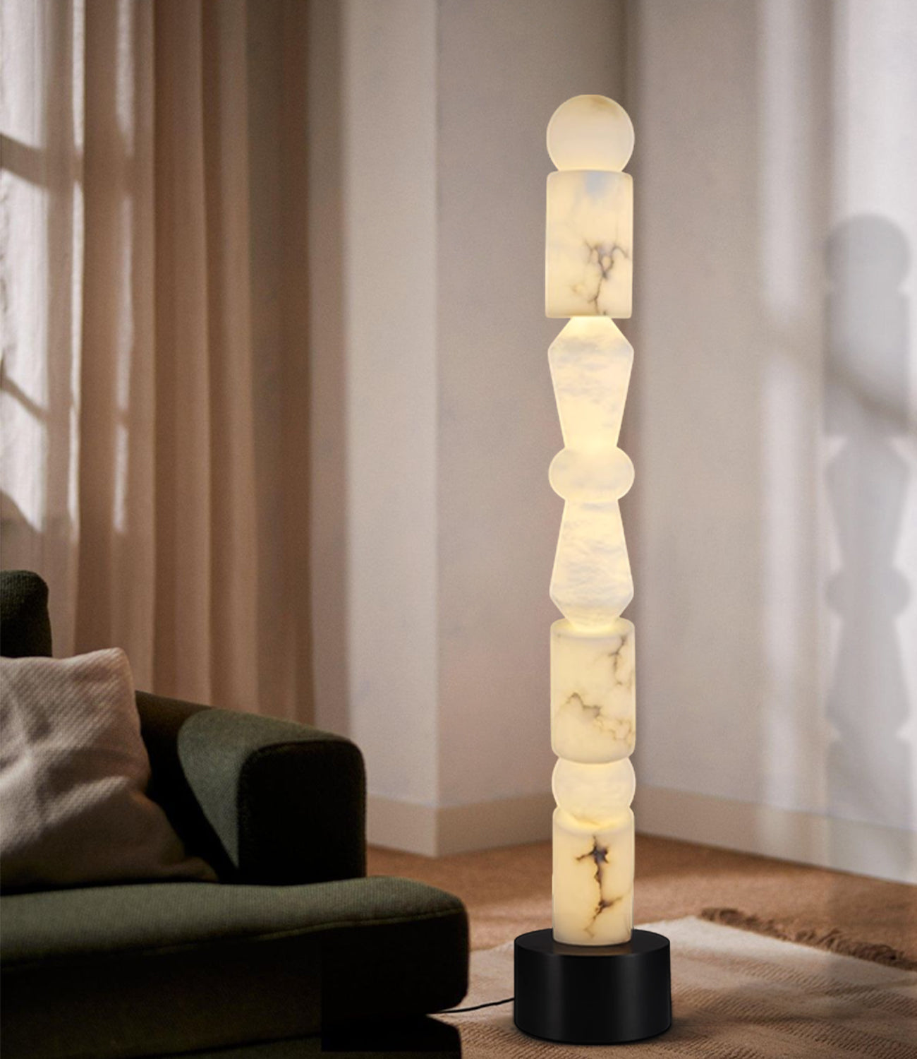Its sculptural stacked-stone column, carved from translucent alabaster, Free combination of five joints, casts a serene, diffused glow that transforms any room into a sanctuary.