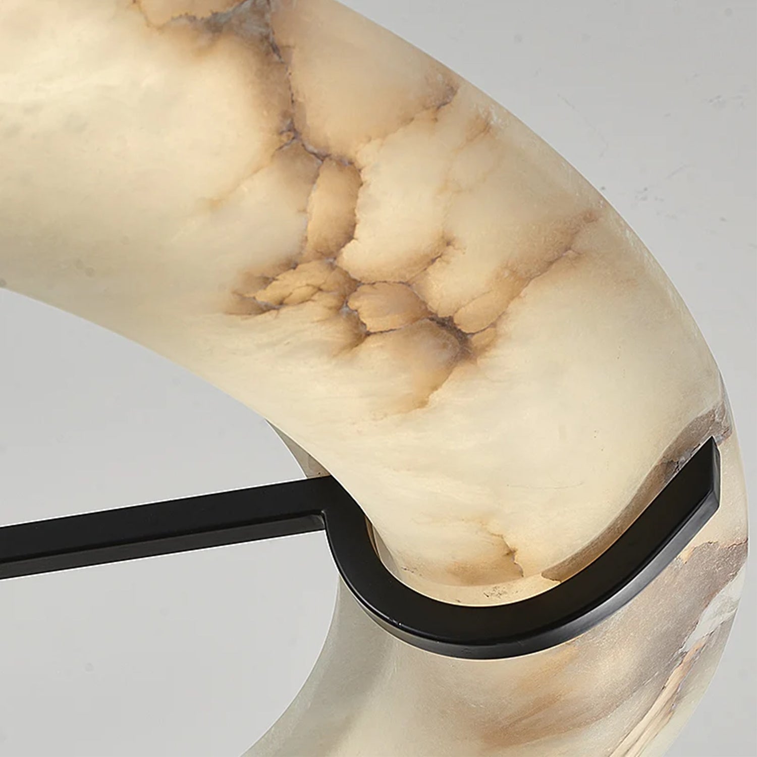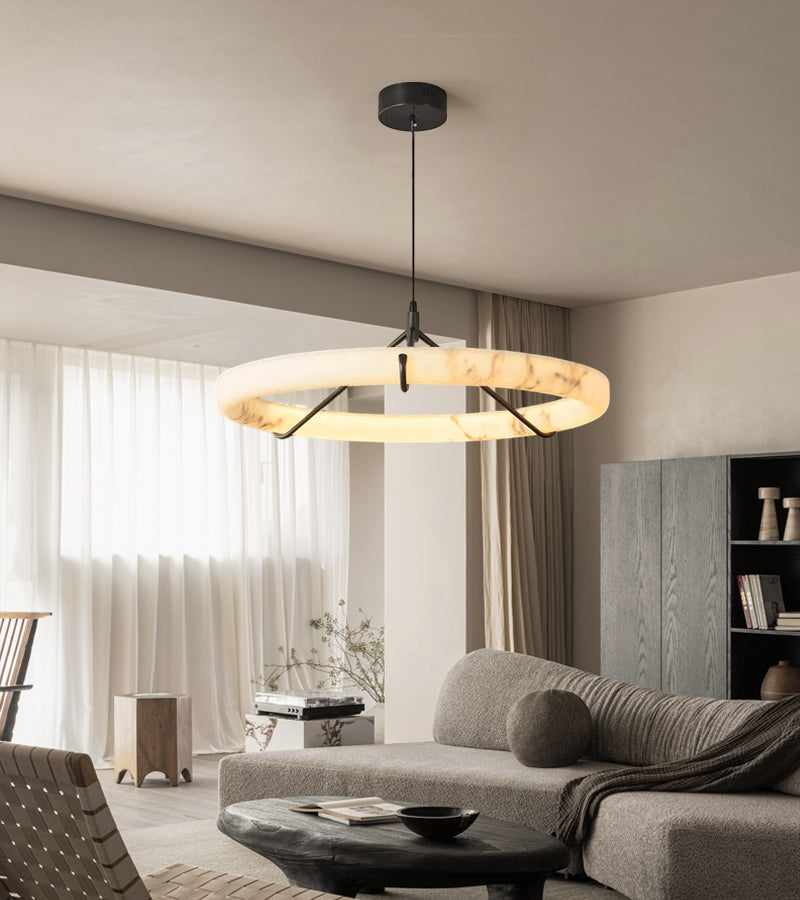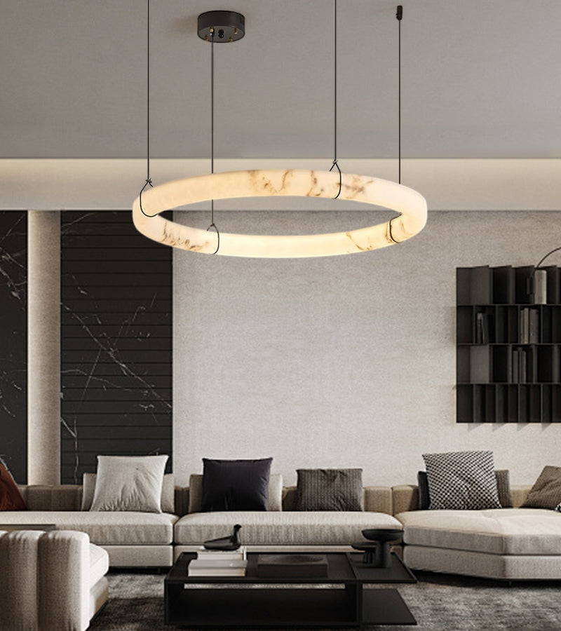 This exquisite chandelier boasts a striking circular design crafted from luxurious alabaster, which beautifully diffuses the light and creates a warm and inviting ambiance.