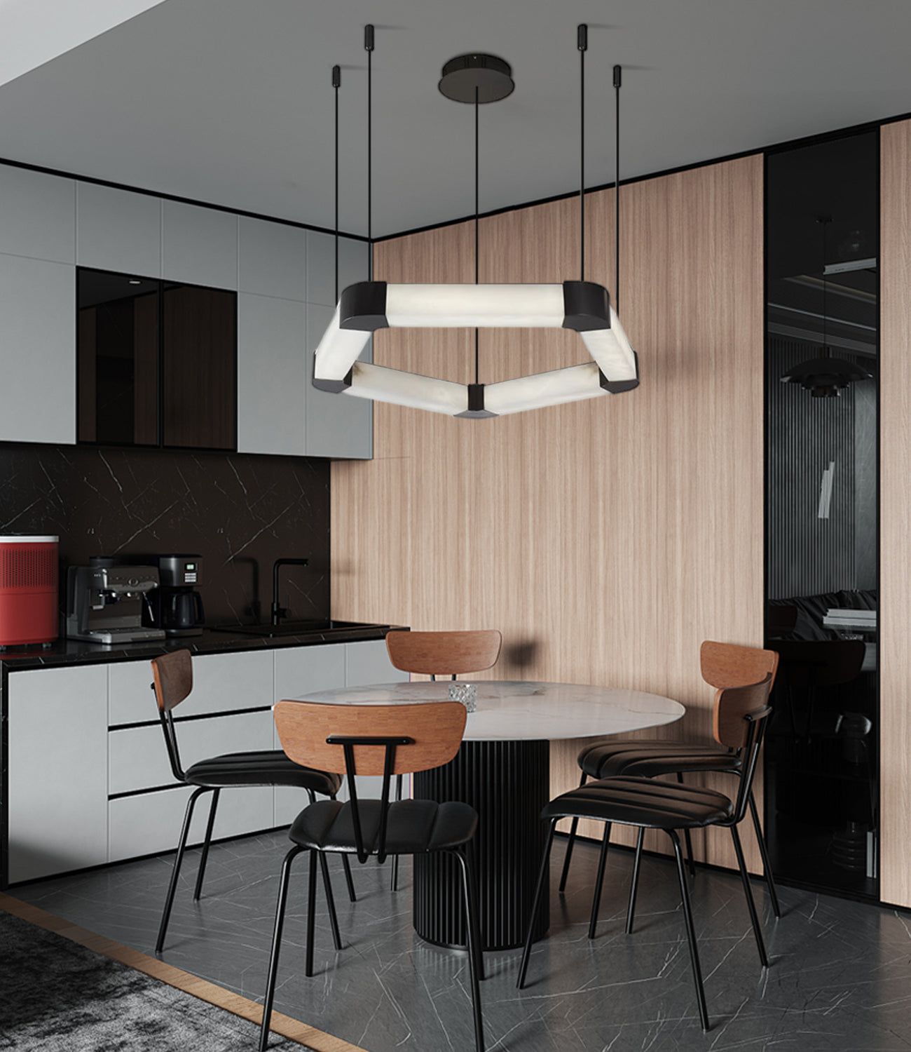 Ring lamps on string suspension in the form of pentagons made of Spanish marble and metal corners, This modular system of softly flowing linear elements can be hung individually or connected in a variety of ways. Perfect for villa,living room,kitchen,restaurant and so on.