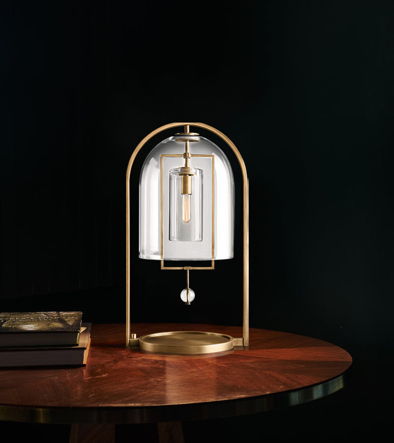 Brass Iron Frame Blown Glass Dome Shade Fulcrum Round Table Lamp 18"