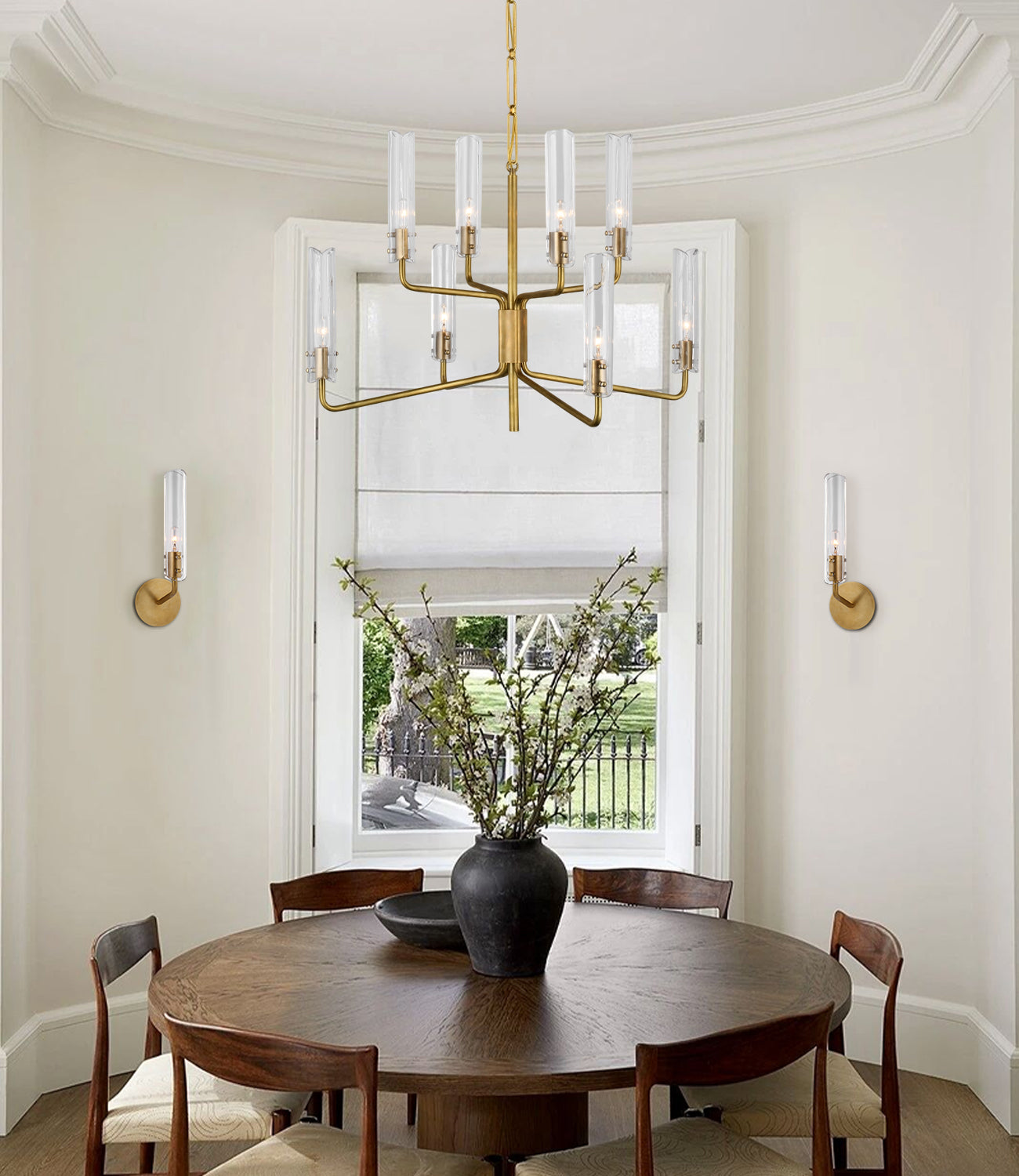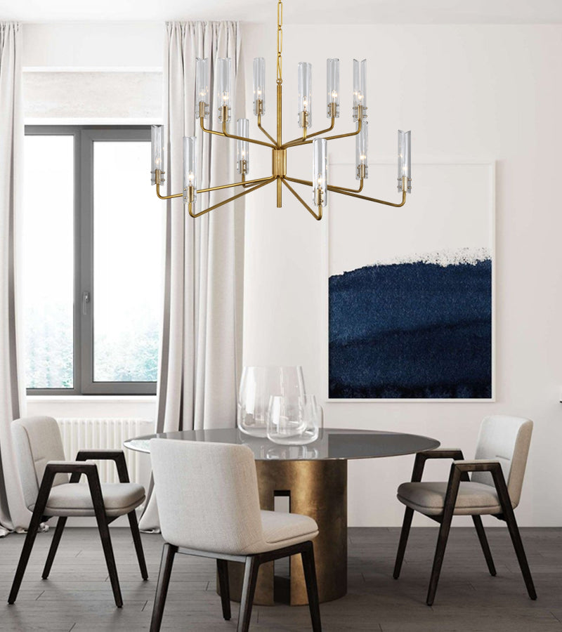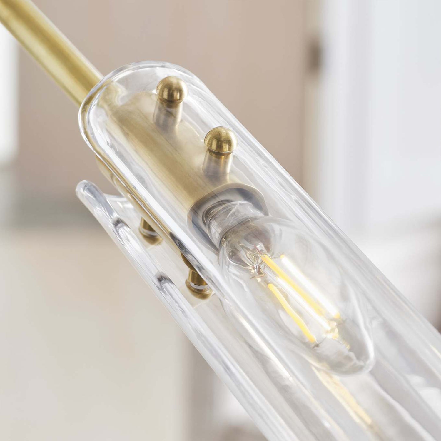 Featuring elongated glass shades on a sculptural linear frame, it creates a warm, radiating ambiance.
