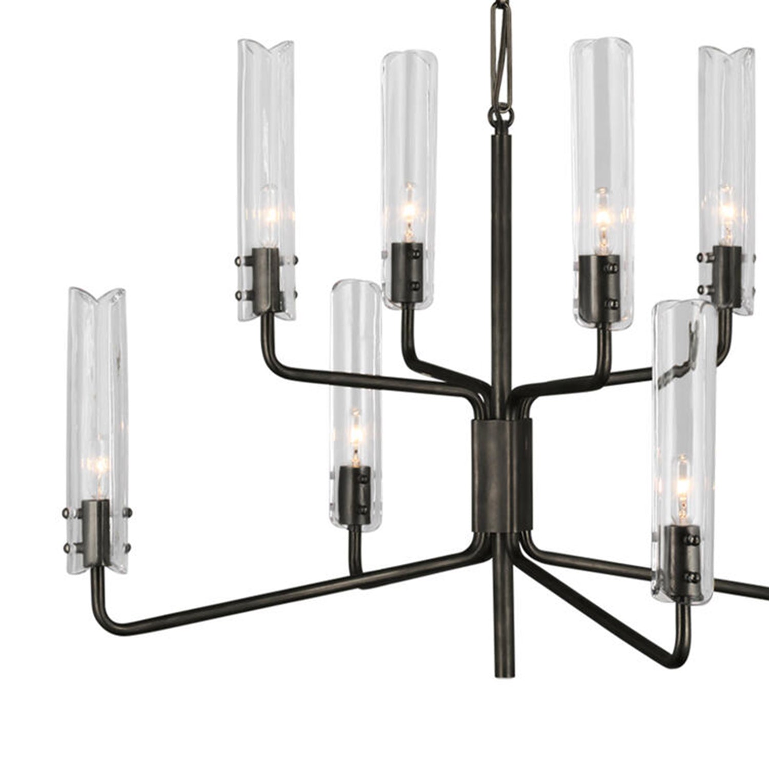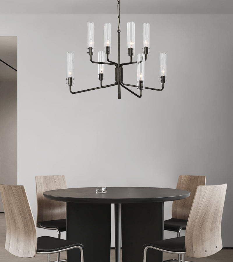The chandelier inspires like a crescendo, with elongated glass shades pointing towards the ceiling. A pair of curve-cut accents top the shades to underline their attention to detail. Bulbs nestled inside accentuate the reflective glass with crisp highlights.