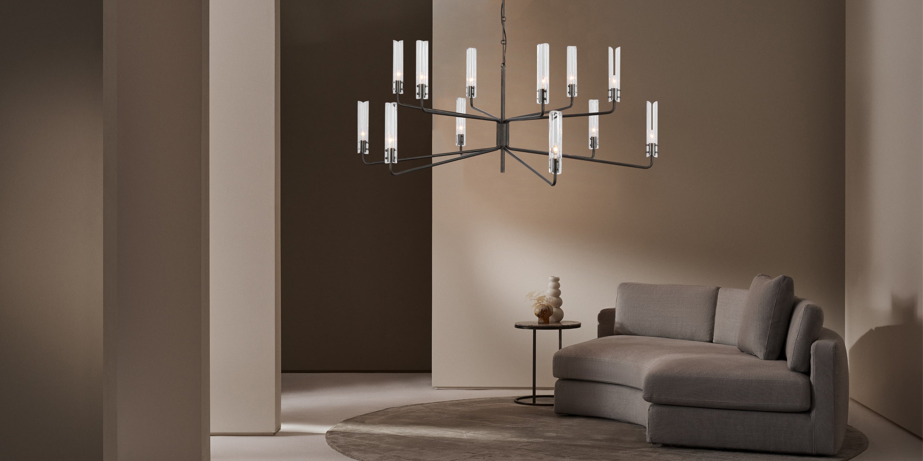 A contemporary interpretation of Mid-Century Modern design, the Casoria chandelier provides an elegant focal point. Crafted from many elongated glass lights on a two-tier linear frame, it has a sculptural quality that adds character to high-ceiling spaces.