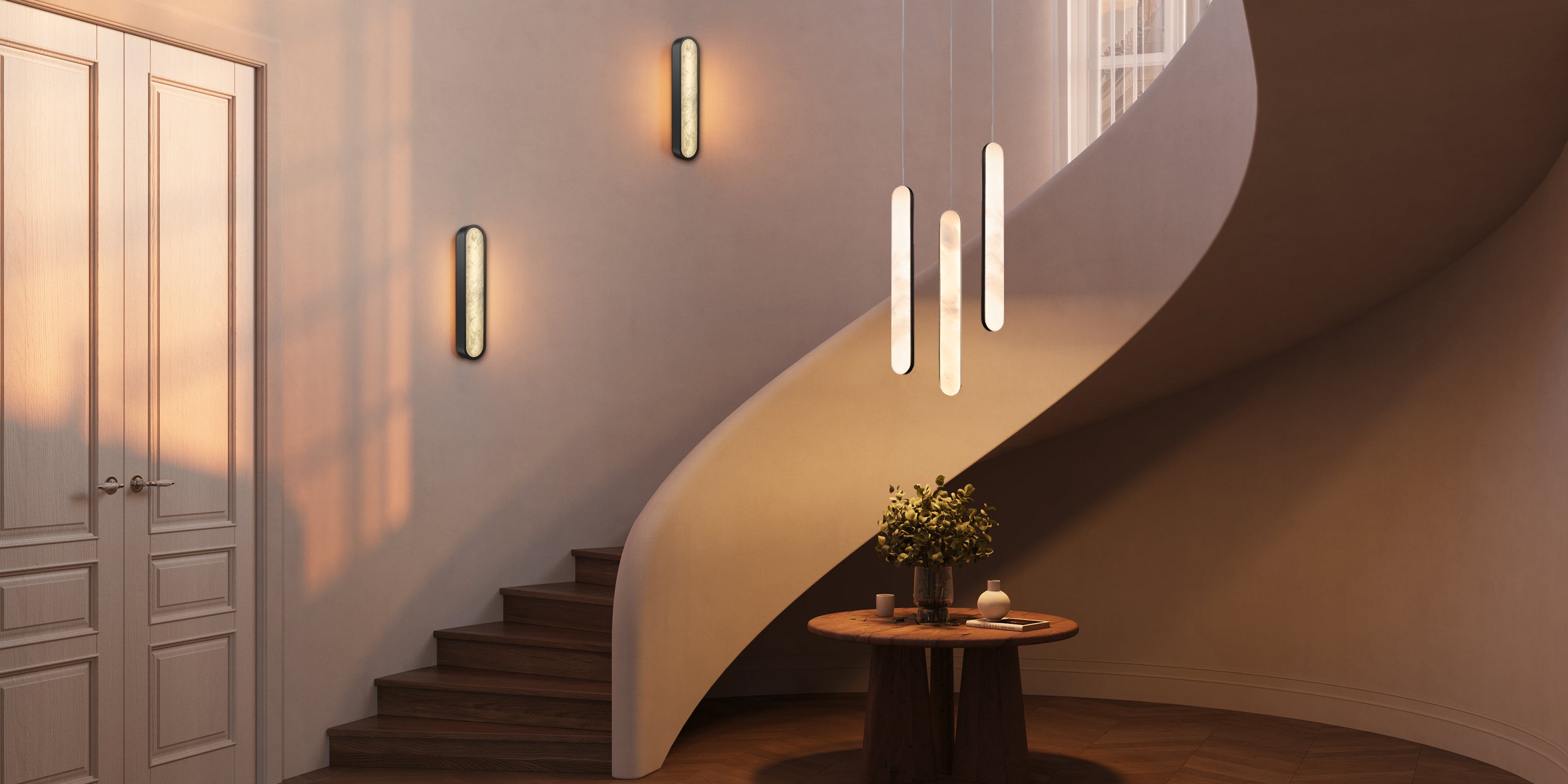 With their soft backlighting, these pendants are a powerful expression of alabaster’s mineral nature. The organic Cadiz pendant radiates a rich, luminous glow from a tall cylinder of Spanish Alabaster encased in slender metallic straps, showcasing the stone's distinctive natural patterns.