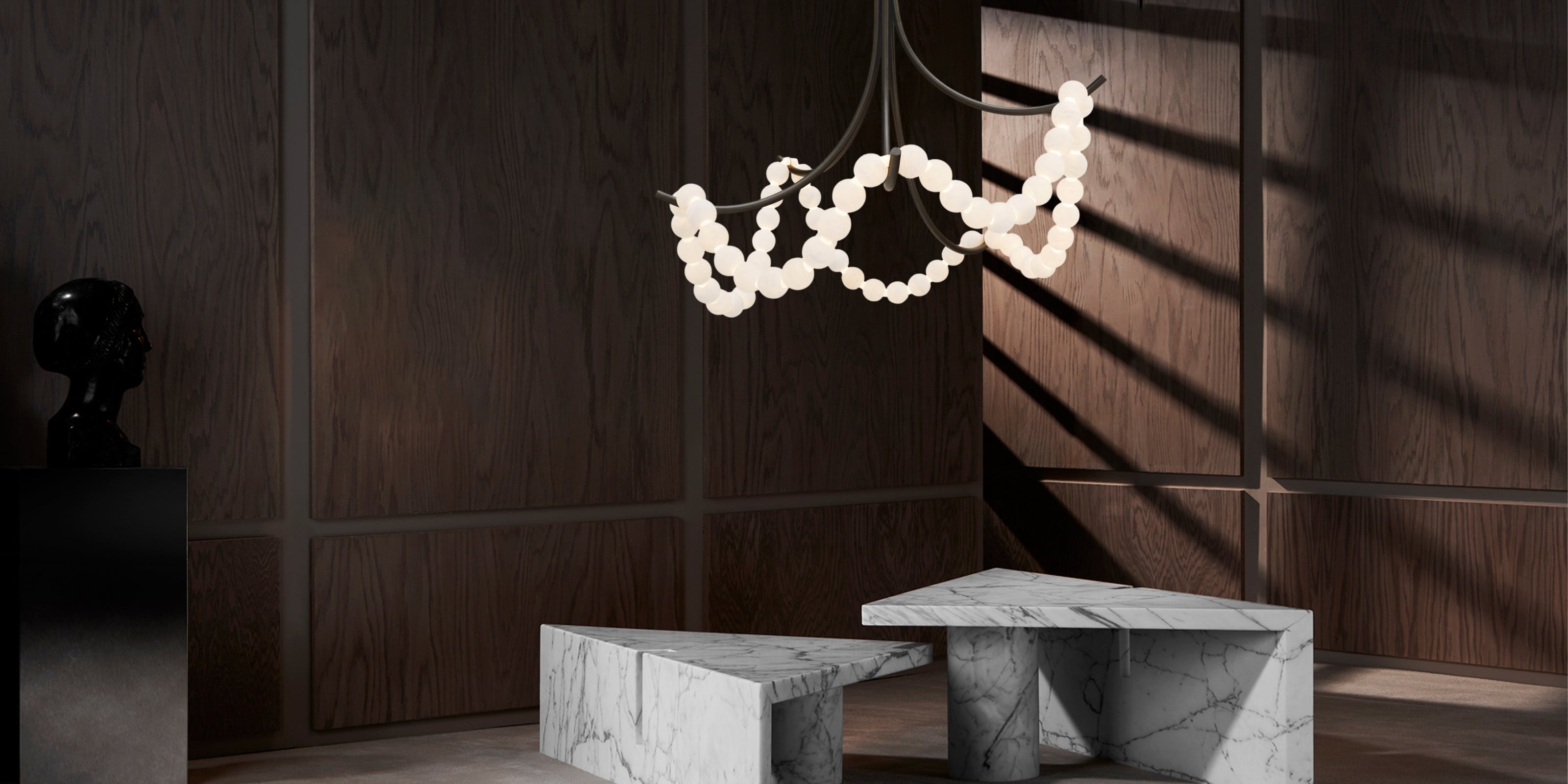 Beads of genuine Spanish Alabaster strung on a radiant LED loop, creating a captivating organic texture.