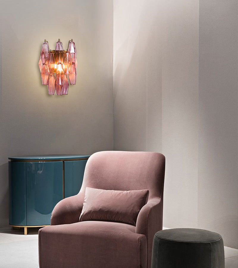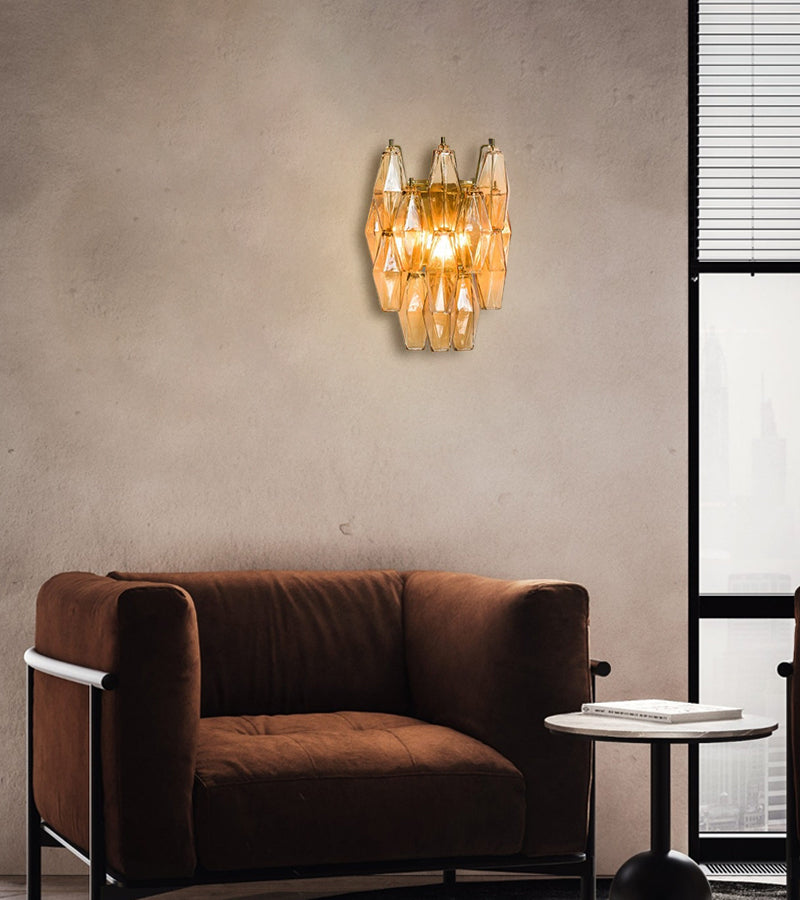 A vintage inspired wall light formed from beautiful, coloured polyhedrons in Pink, Amber, Lilac and Smoked glass and tiered in a striking diamond formation. Each piece of glass is individually bolted to a brass finish frame.