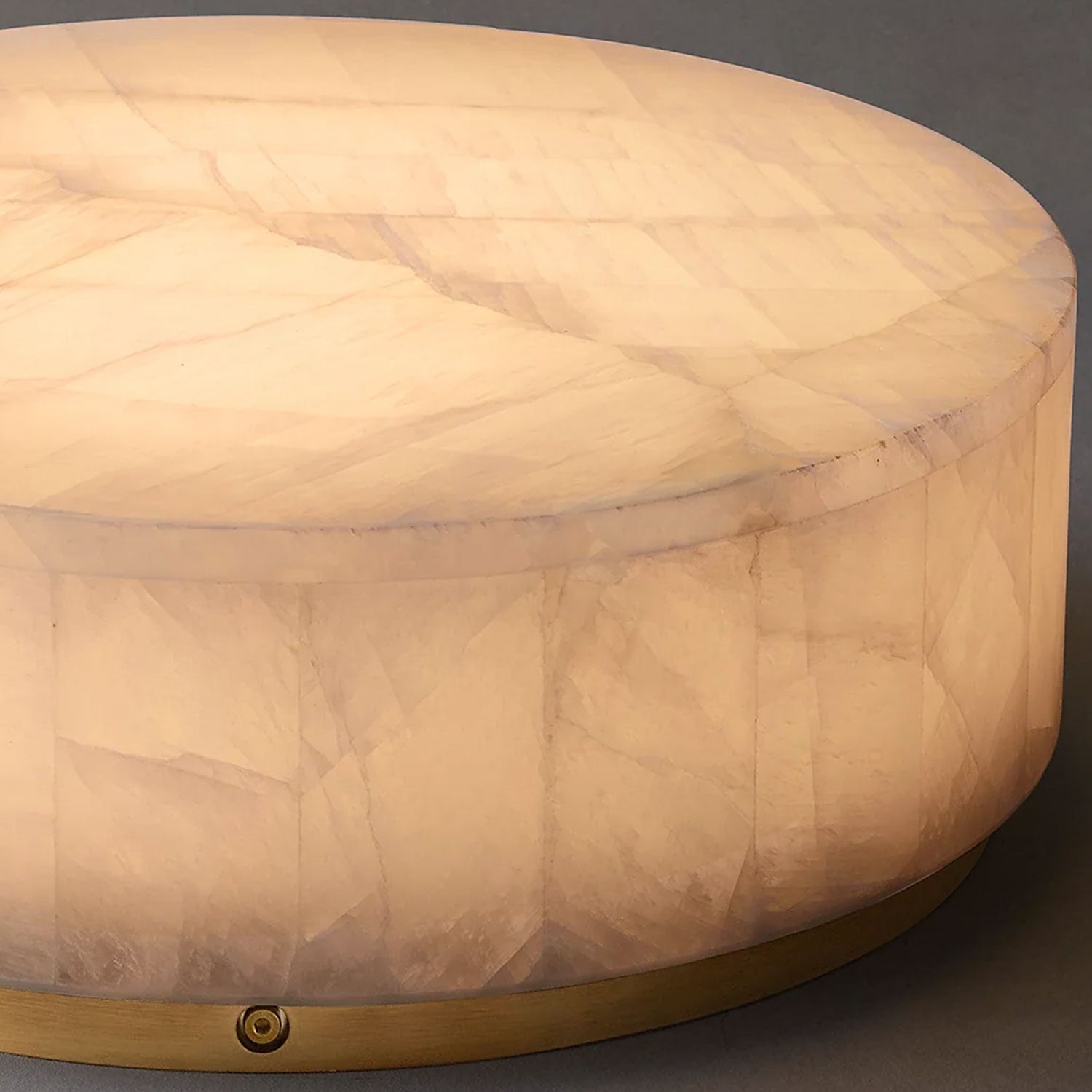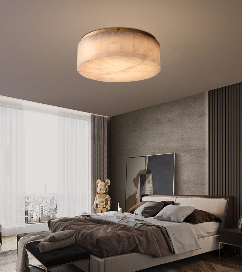 Round Alabaster flush mount ceiling light in brass frame for bedroom