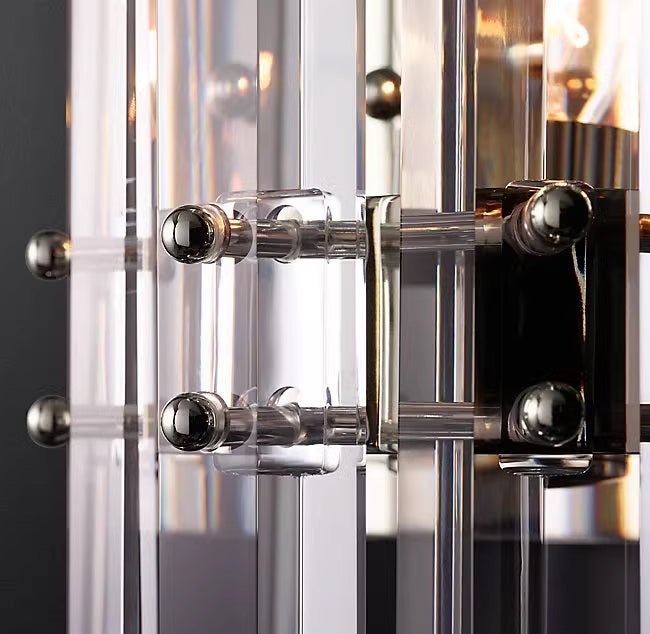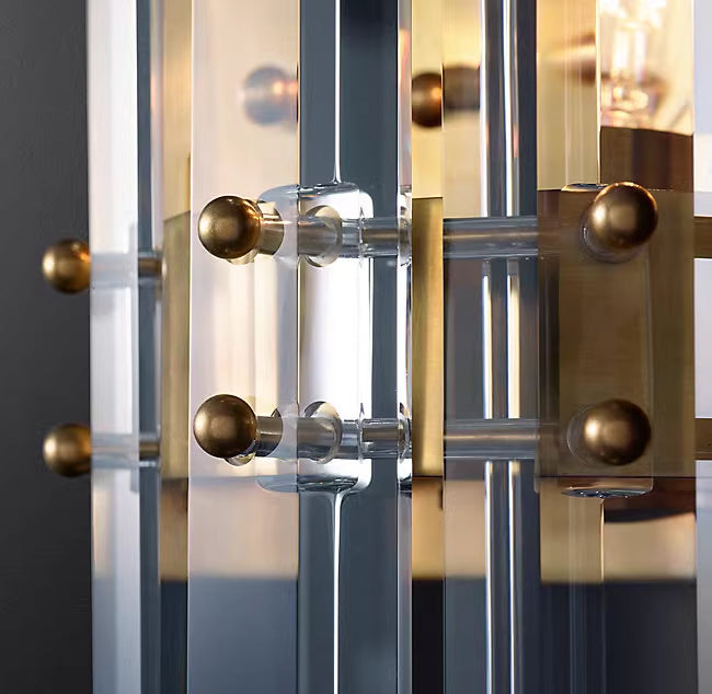 The Wall Sconce is made of solid brass and prismatic K9 glass, a type of crystal used to make optical lenses and prisms. The concentric ring of faceted crystal refracts light inward and outward, which paired ultra-clear glass with a solid brass frame.
