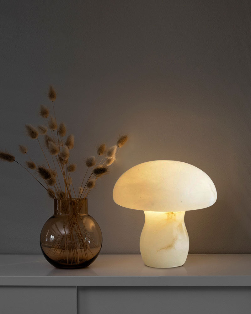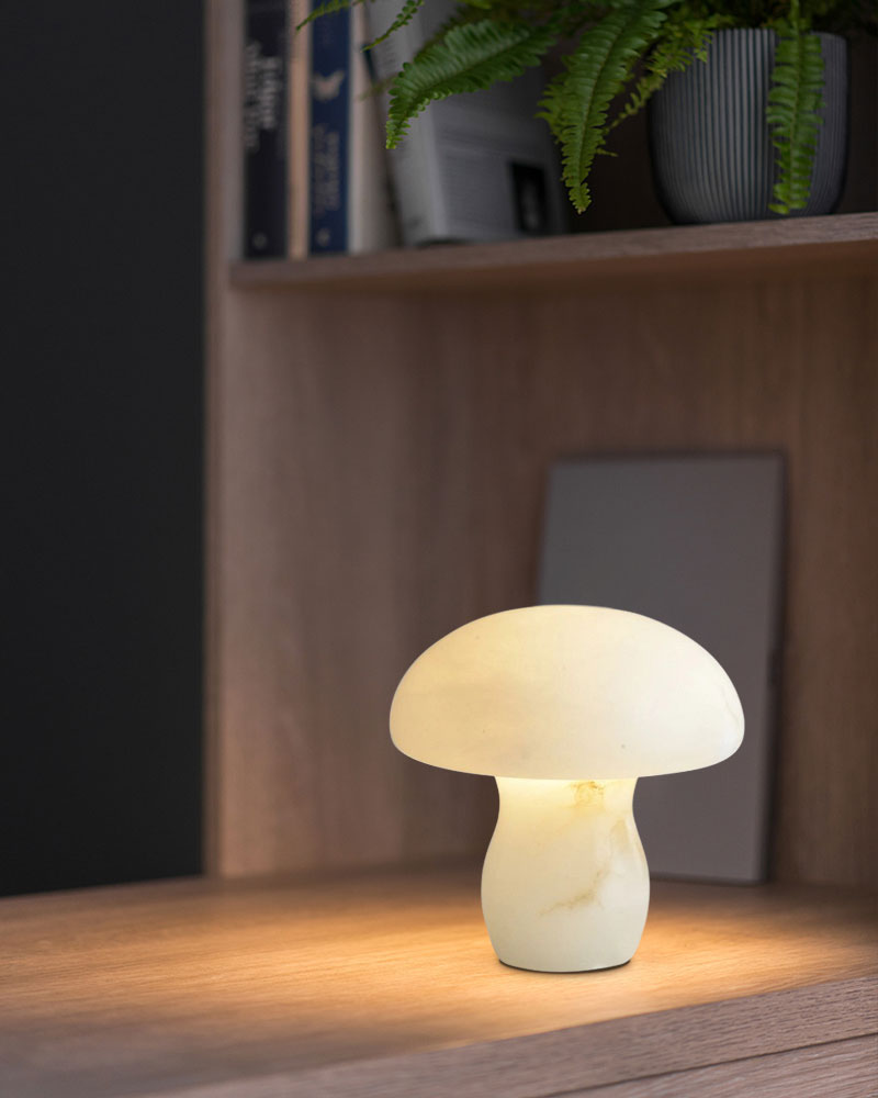 Cast a whimsical glow on desktops and bookshelves with this mini lamp in the shape of a mushroom. With an LED light inside the mushroom lamp, the translucent, white alabaster surface emits a soft glow that sheds warm light in a 360-degree radius.
