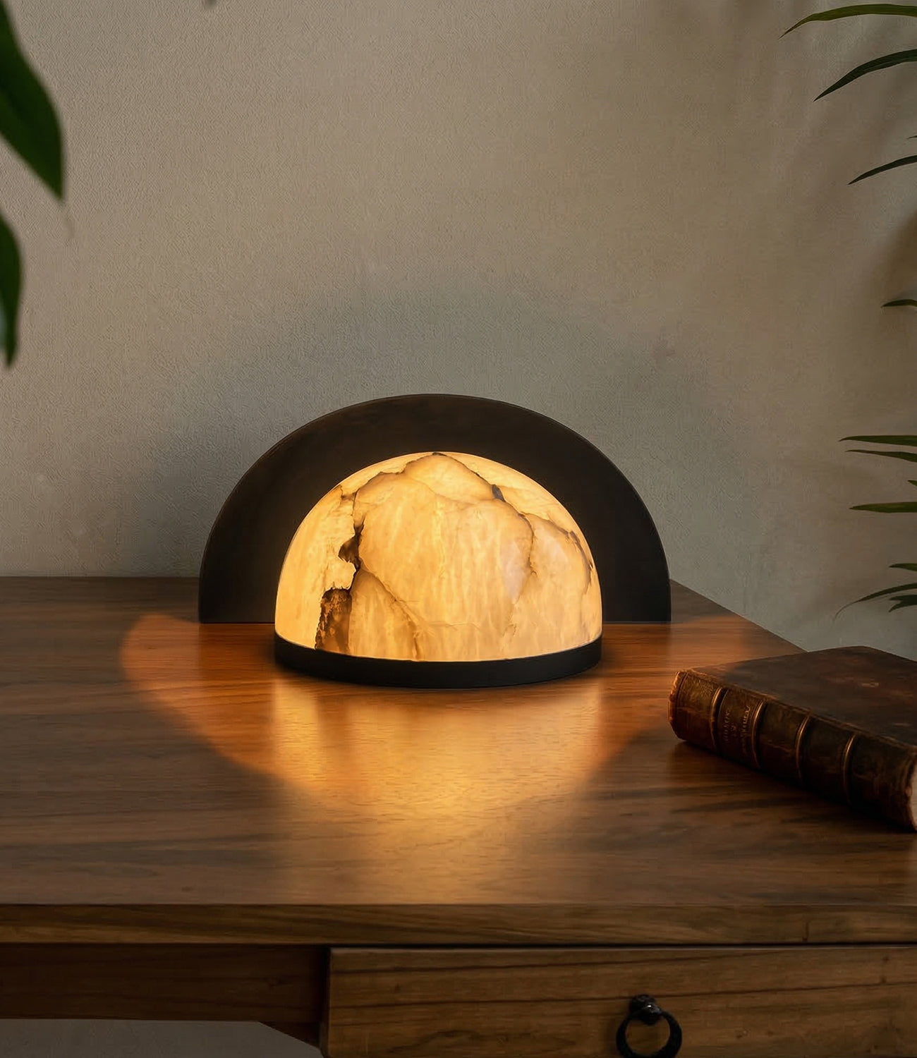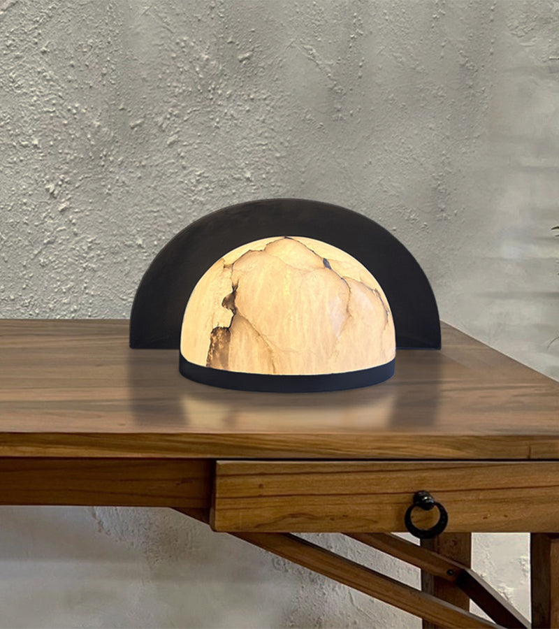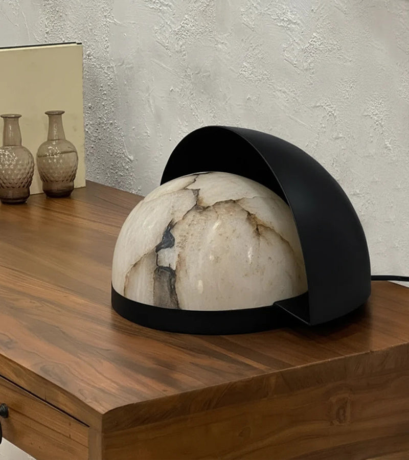 A masterpiece of contrast, the Eclipse Table Lamp marries the raw, ethereal beauty of natural alabaster with a sleek, architectural matte black finish. Its semi-spherical metal shroud partially veils the stone, creating a soft, directional glow that highlights the unique veining of the mineral.