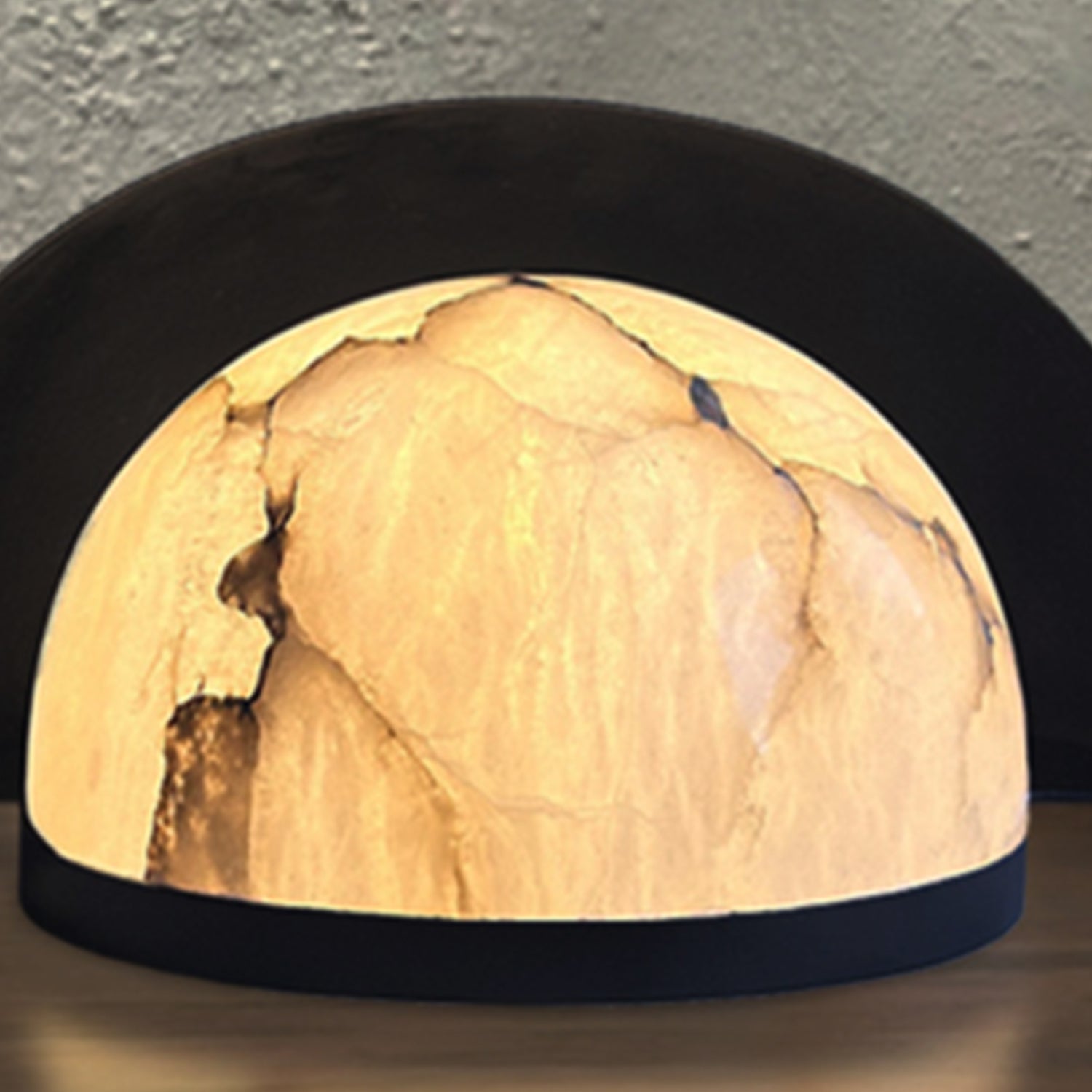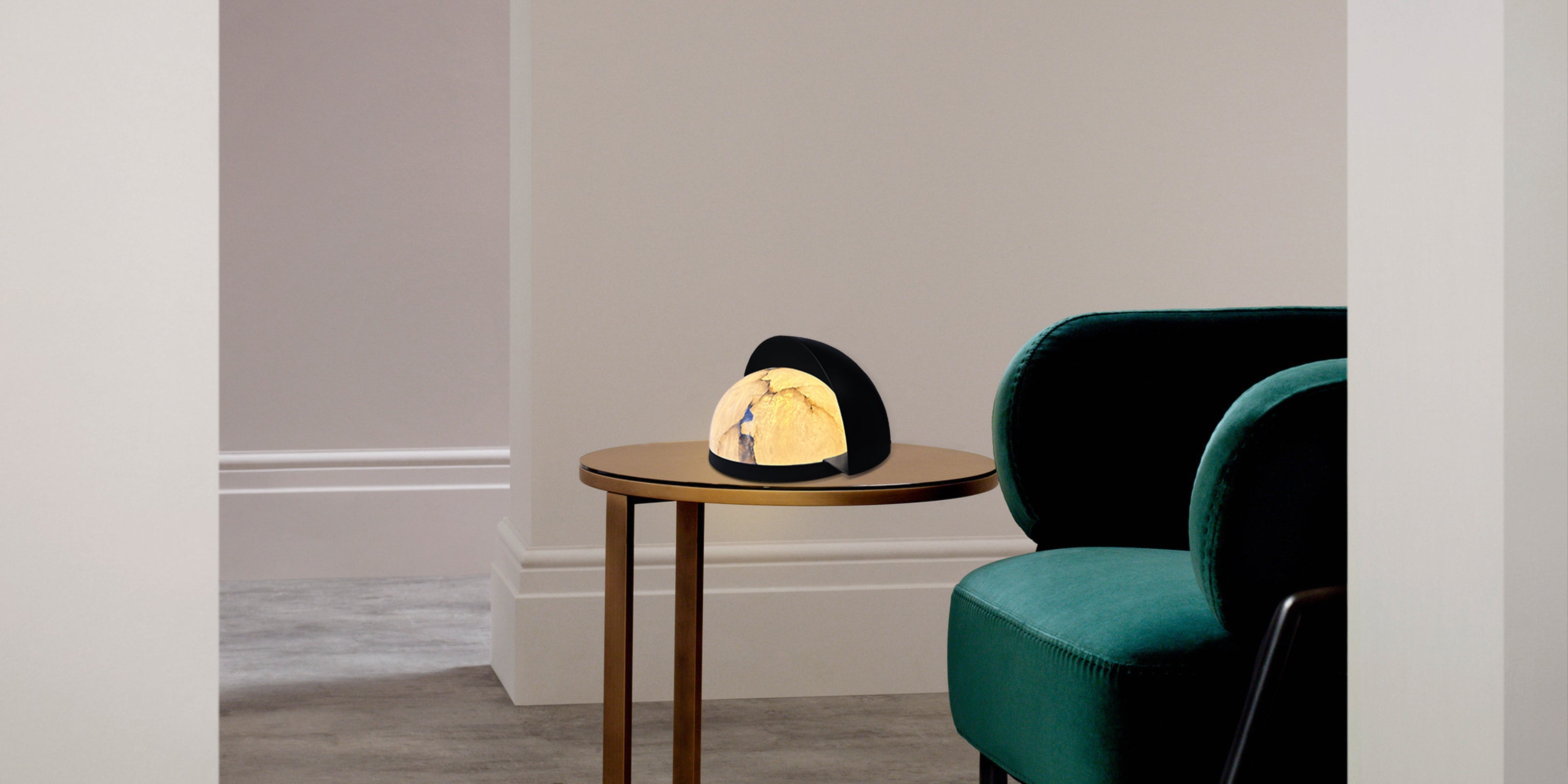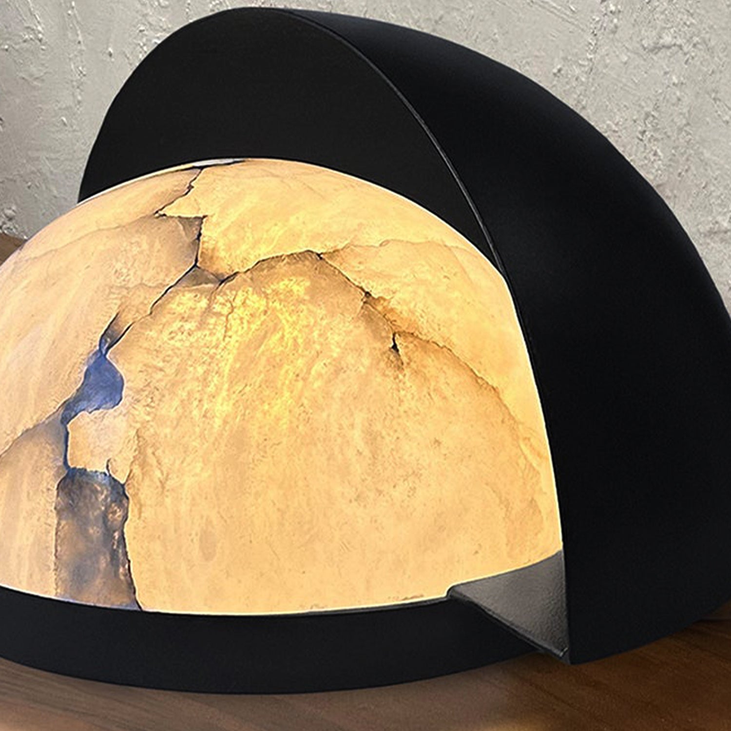 A masterpiece of contrast, the Eclipse Table Lamp marries the raw, ethereal beauty of natural alabaster with a sleek, architectural matte black finish. Its semi-spherical metal shroud partially veils the stone, creating a soft, directional glow that highlights the unique veining of the mineral.