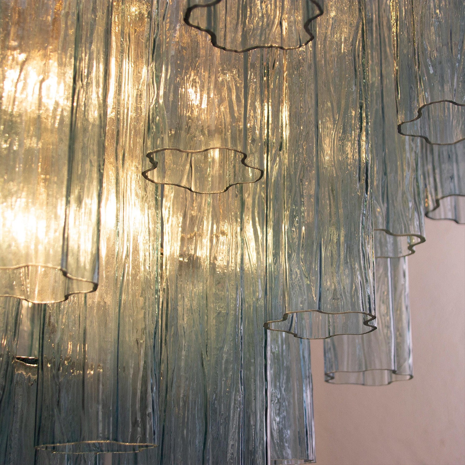 Chandelier of refined elegance. The blue hues reflect the light harmoniously. Made of pure Murano glass elements.