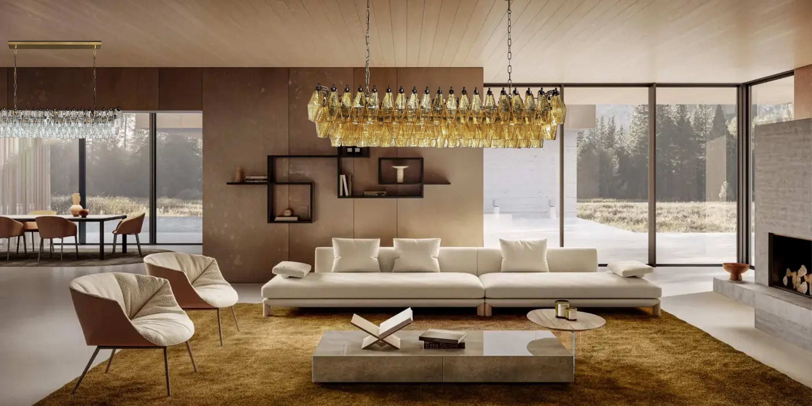 The lamp body is composed of dozens of handmade glass polyhedrons (Poliedri), which are neatly arranged to form a stacked design, showing an elegant geometric sense and light and shadow effects. Each piece of glass is made with Murano's traditional blowing technology, revealing a delicate hand-made texture and showing a warm and soft glow under the light.