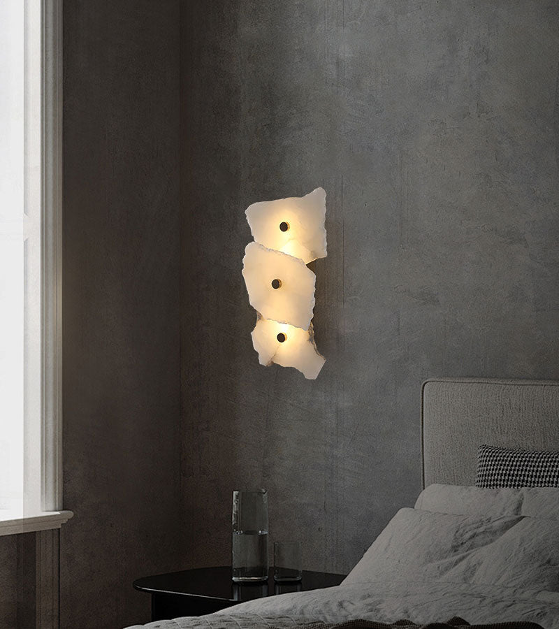 Add a touch of art deco elegance to your home with the White Marble Slice Metal Wall Sconce. This exquisite fixture features random-shaped marble slices, each piece showcasing its own distinct veining and translucence, set against a sleek metal backdrop.