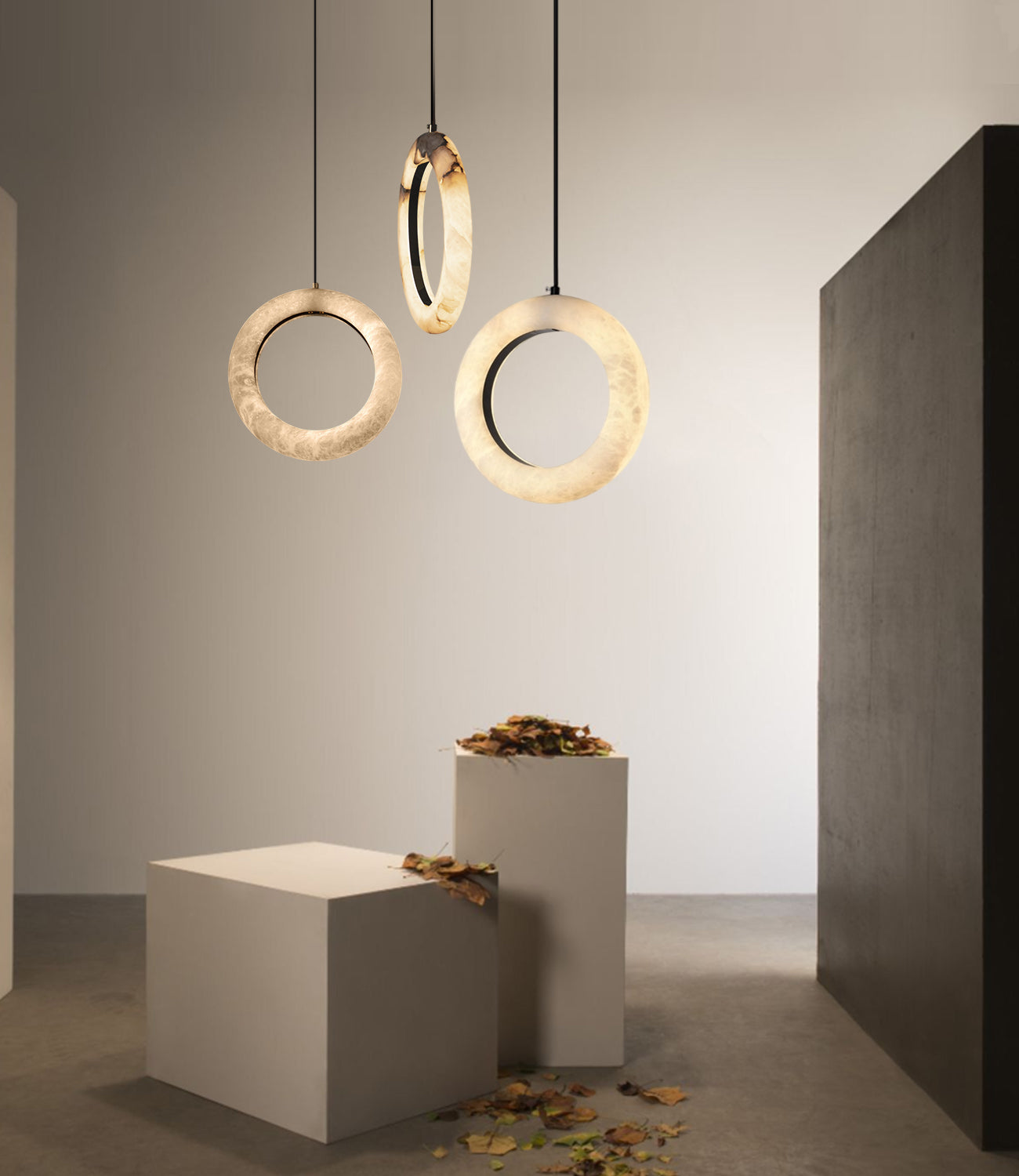 The circular structure, with the texture of the alabaster combined with the lines of the stainless steel material, creates a simple yet elegant appearance.