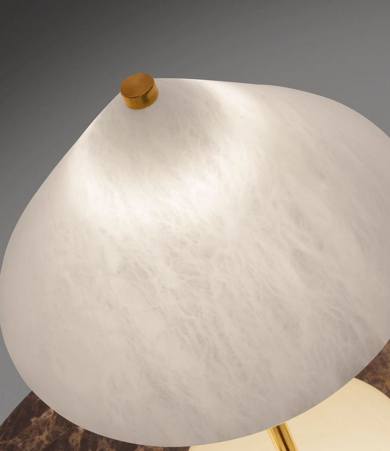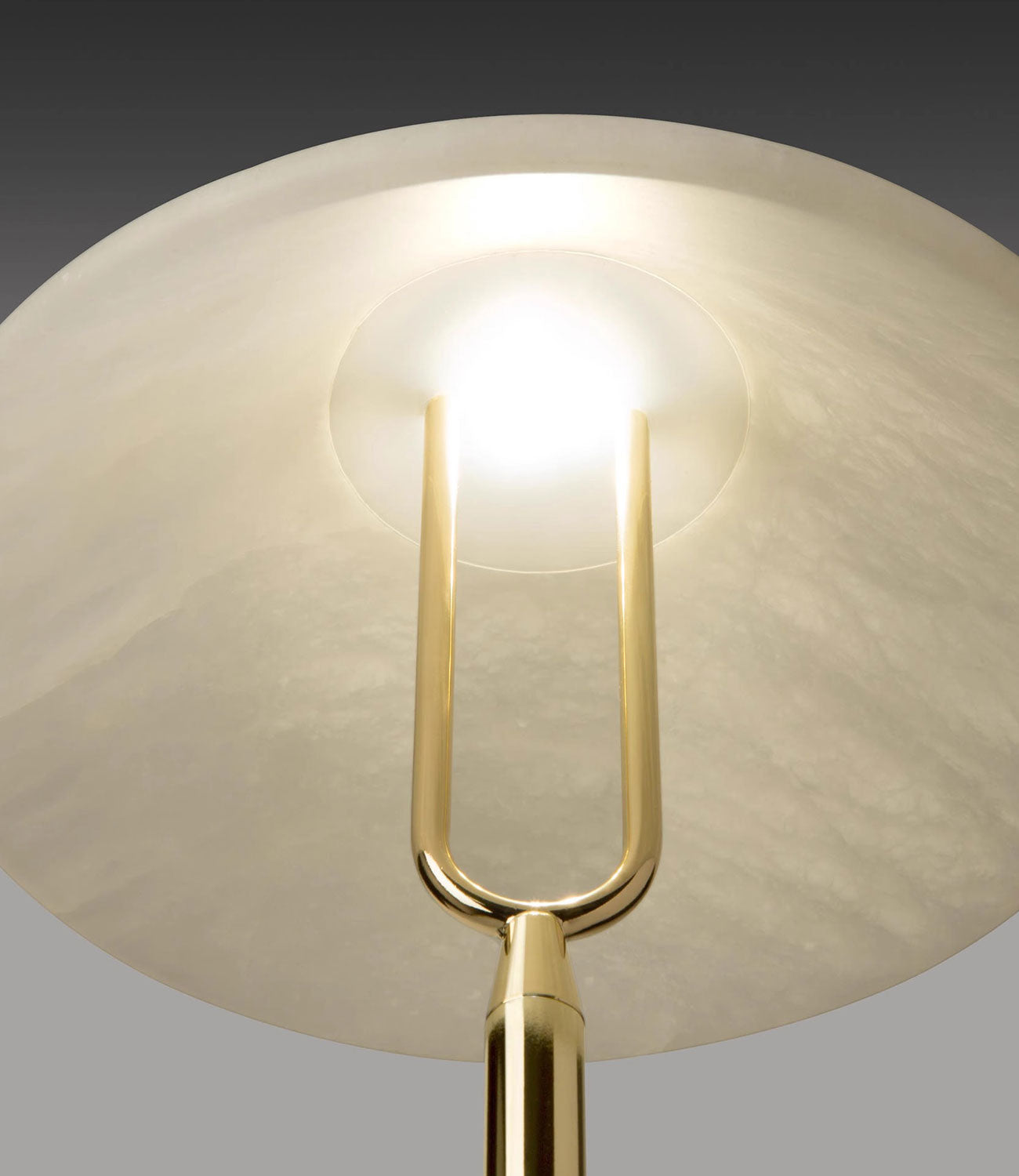 Alabaster’s natural texture with the clean shade by cone shape presents an abstracted volcano silhouette with a refined note. The striking shade tilts one’s head back as it tops a tall, handsome column, defined by a pronged accent. Fitted with LED, the piece generates a soft surrounding glow and displays an unforgettable.