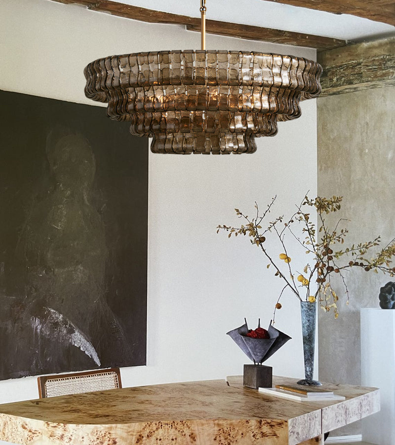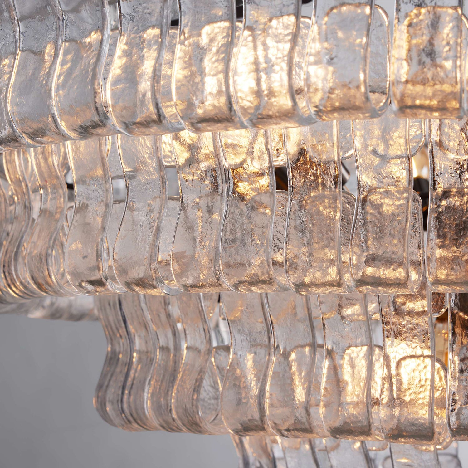Our Ghiaccio Chandelier artfully diffuses light through pieces of curved, textured glass. Complemented by a plated-brass or bronze finish, Ghiaccio elegantly illuminates any room.