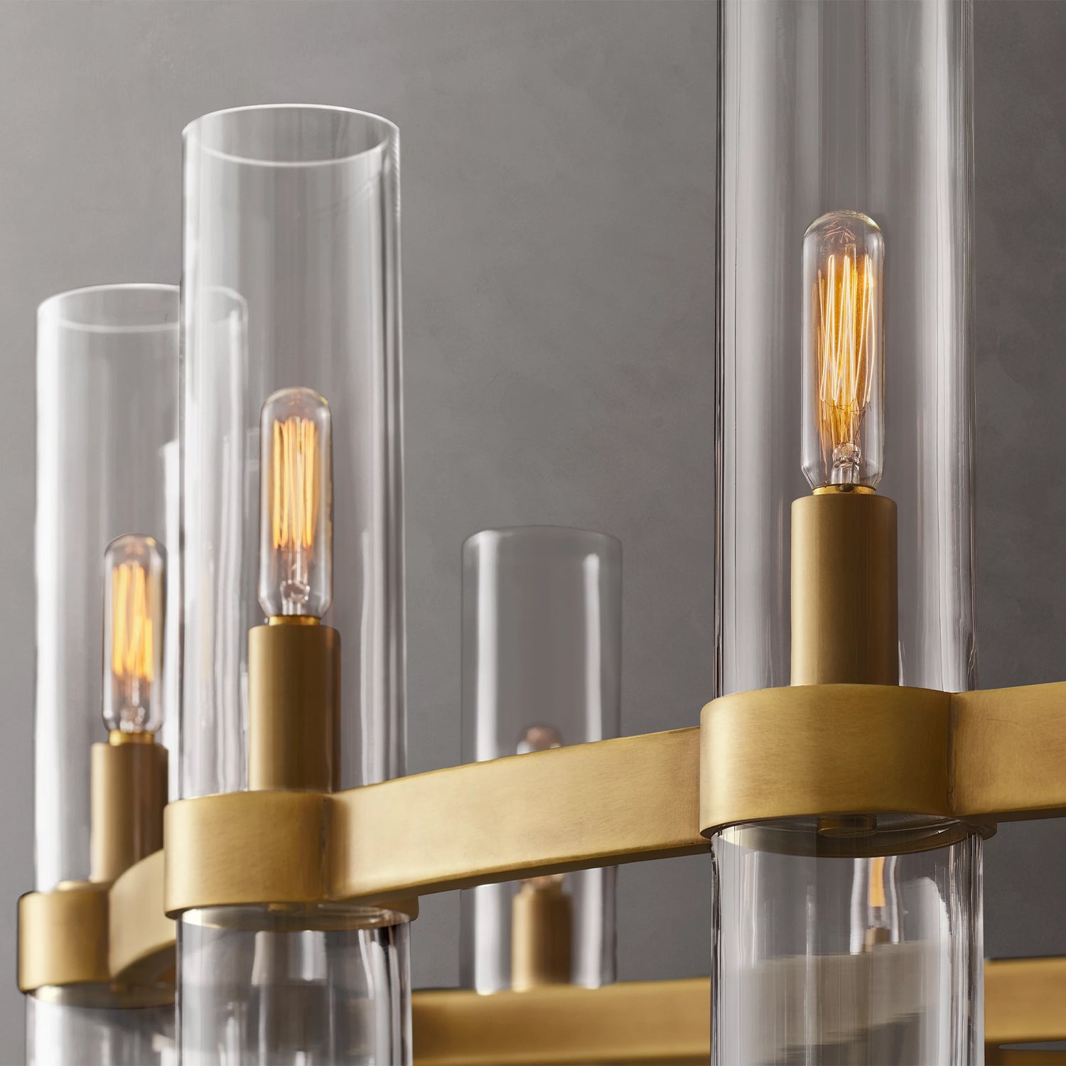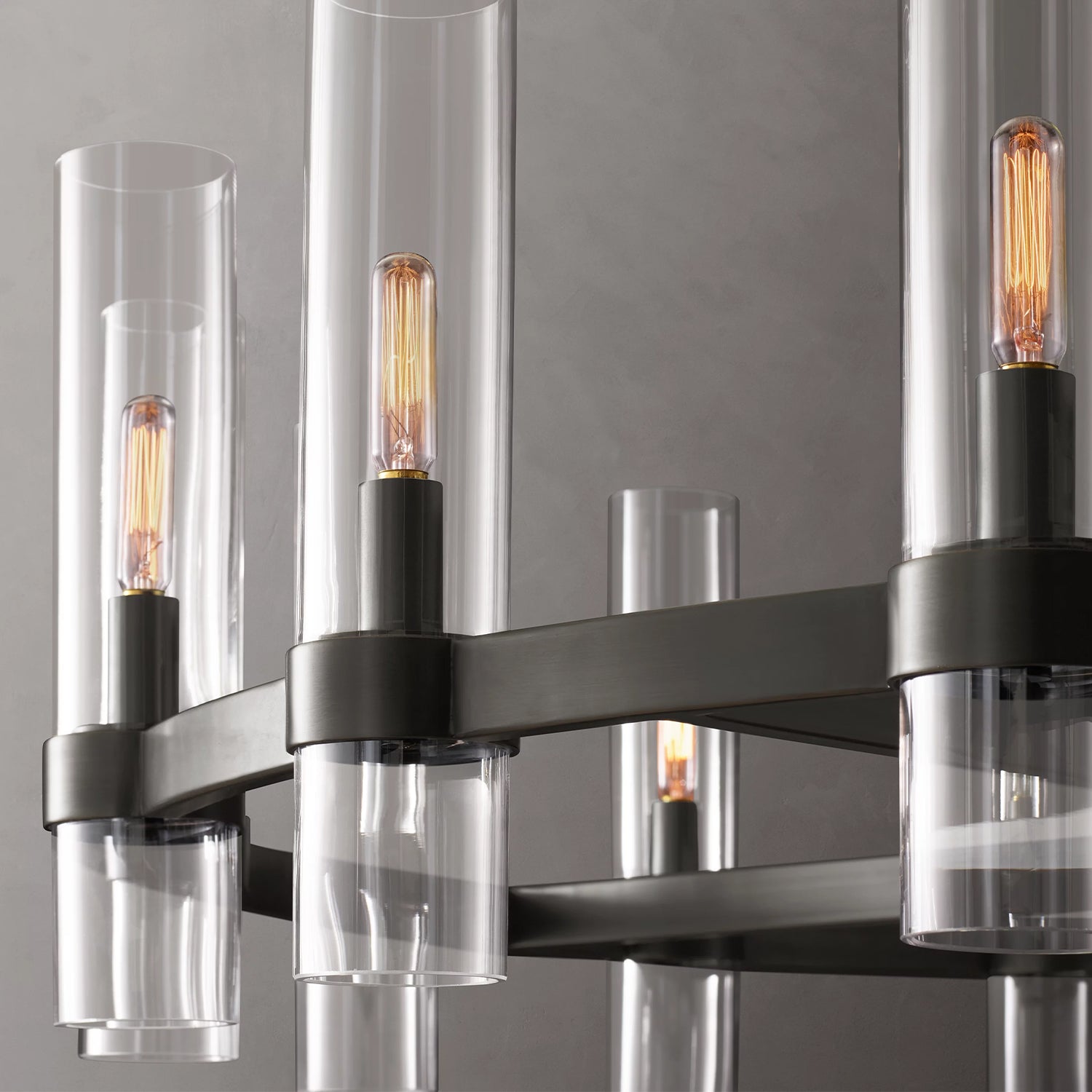 The Ravelle chandelier is adorned with sleek cylindrical glass shades, each housing a single exposed bulb.