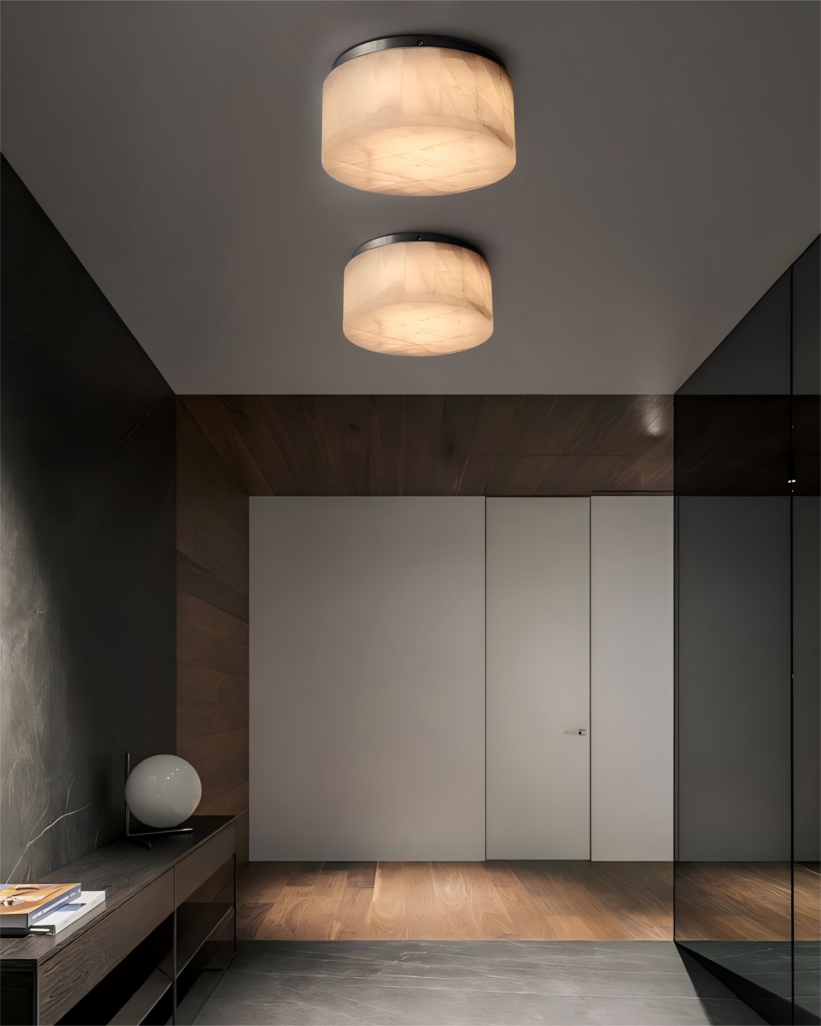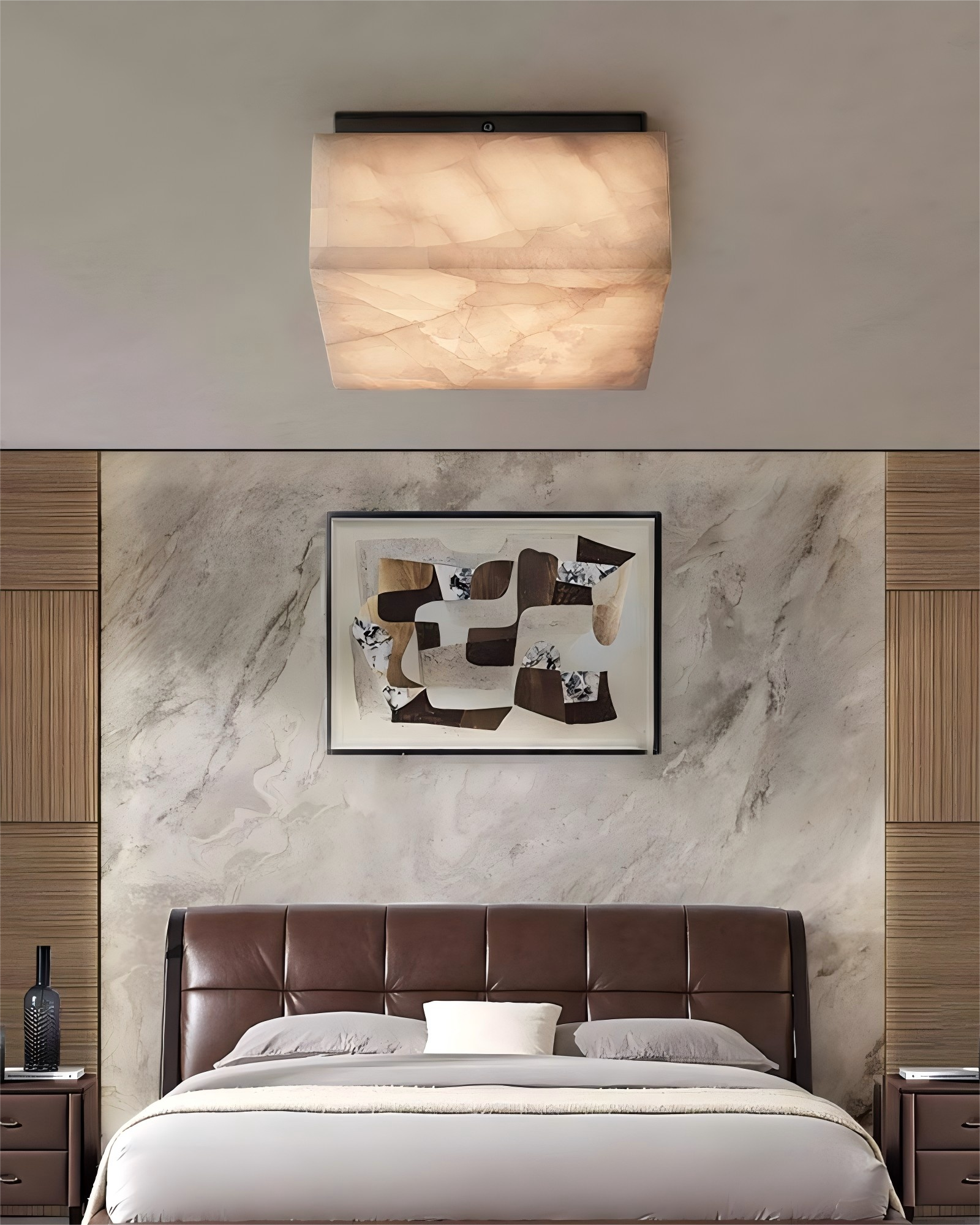 - Natural Material: Translucent calcite/alabaster stone with warm veining.