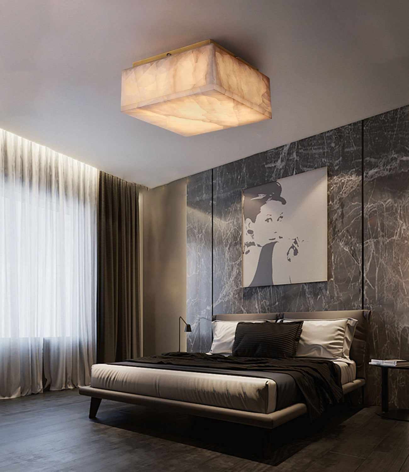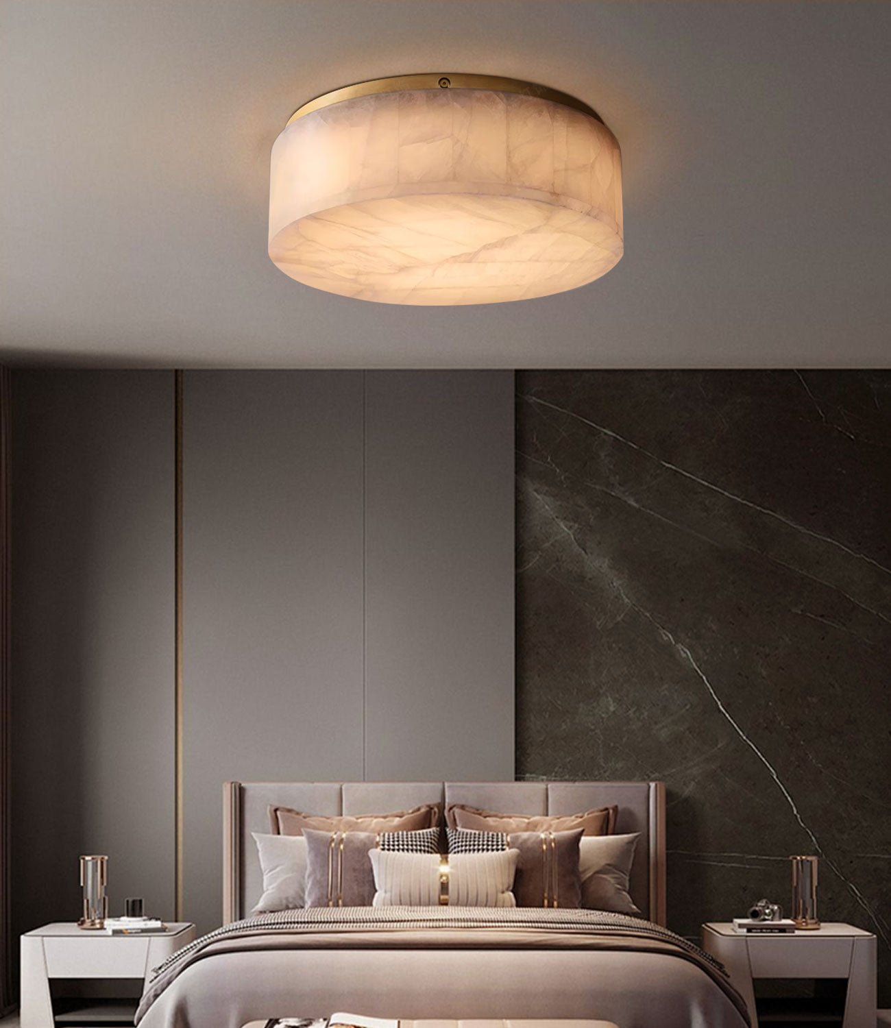 This series flush ceiling light has been crafted from turned white alabaster plate, lifting your lighting scheme with a soft glow. Its chunky fixture ceiling board is finished with brass details. A one-of-a-kind design for every room in the home, including the bedroom,villa,corridor,hotel and other places.