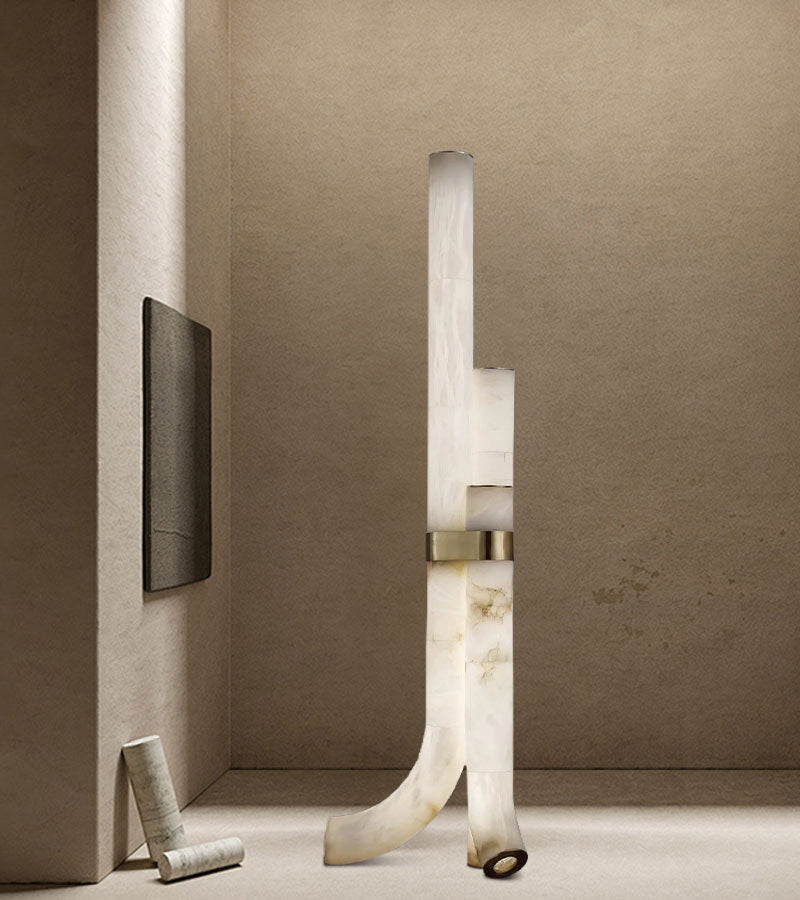 This Piped Alabaster Floor Lamp features three piped Marble shades joined together in a unique geometric style for a modern, minimalistic look. Enjoy the beauty of natural stone, lit up with a warm glow for an elegant, sophisticated atmosphere.