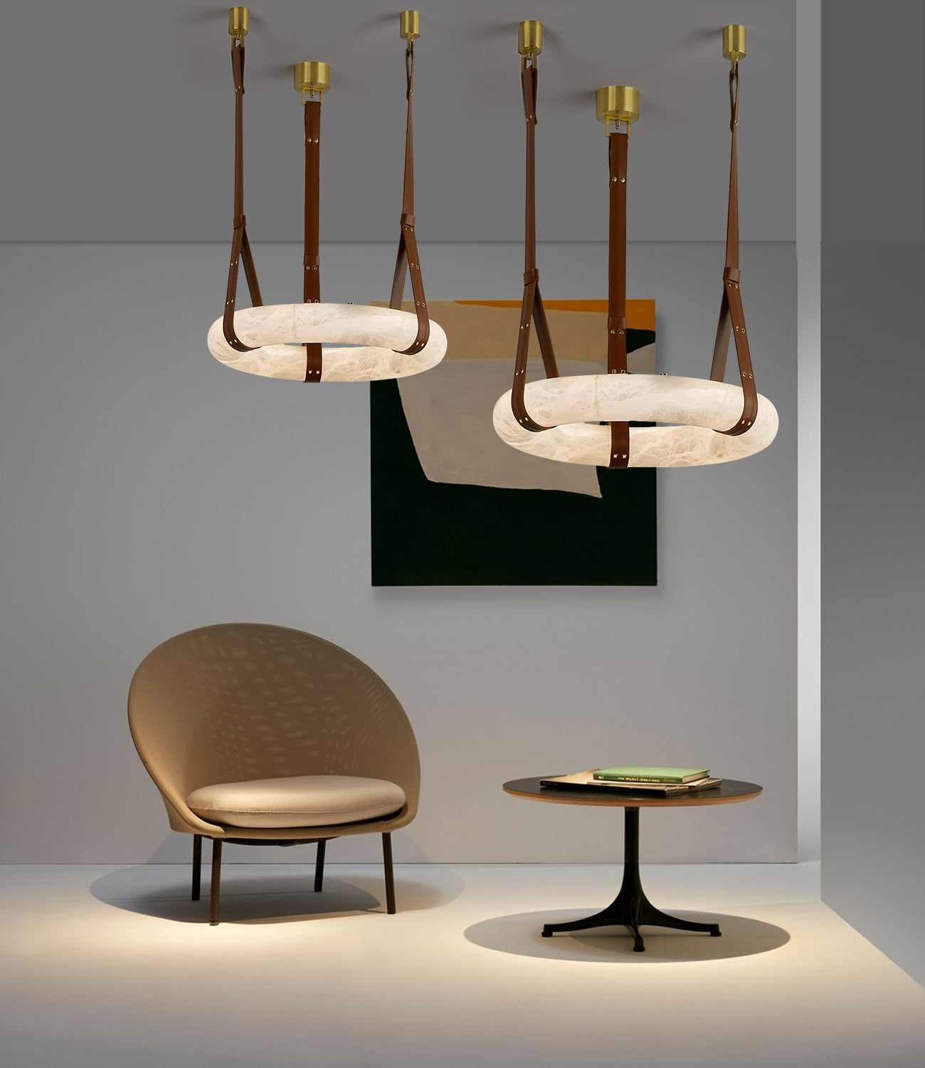 Leather Cable Alabaster Pendant Halo Ring Chandelier with Canopy